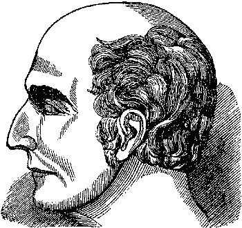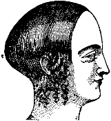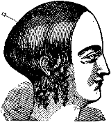 The relative size of Approbativeness and Self-Esteem may be found thus: Place one hand, say the left, upon the forehead, and steady the head; point the finger from above directly down upon Firmness; then move it two inches directly backward, and place the balls of the second and third fingers upon the points just found. If Self-Esteem be small, these balls will fall into the hole which indicates its deficiency, while the ends of the fingers will strike upon the swells caused by Approbativeness, if this organ be large; and the middle of the second joint of these fingers will apprehend the size of that lobe of Approbativeness which is next to it. Or thus: Stand behind the patient, and so place your fingers upon his head that the second finger shall reach upward to the back part of Firmness, then lay the first and second joints of that finger evenly with the head, and place the first and third fingers upon the head alongside of it. If Self-Esteem be larger than Approbativeness, the second finger will be pushed up farther than the others; but if the two lobes of Approbativeness be larger than Self-Esteem, the second finger will fall into a hollow running up and down, while the first and third fingers will rest upon the two lobes of Approbativeness. Or thus: In nineteen females out of every twenty, Self-Esteem will be found small and Approbativeness large, and by applying this rule to their heads, a hollow will generally be found at Self-Esteem and a swell at Approbativeness, by which you can localize[Pg 132] these organs; and a few applications will soon enable you to form correct ideas of their appearance when large or small.