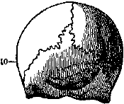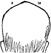 To return to Philoprogenitiveness. Three fourths of an inch ABOVE this point, Inhabitiveness is located. When this organ is large, and Continuity is moderate, there will be found a prominence somewhat resembling an angle of a triangle, with the angle at the middle of the head, together with a sharp prominence at this point. But when Inhabitiveness is small, there will be a depression just about large enough to receive the end of a finger, with the bow downward. An inch on each side of this point is Adhesiveness. Or thus: taking the backward termination of that line already drawn, erect upon it a right-angle triangle; let the right angle be on Philoprogenitiveness, and the two sides which inclose this angle be about an inch and a half or three quarters each, and the other two angles will be on the two lobes of Adhesiveness—the hypothenuse, or long side, being about two inches, or two and a half inches, in[Pg 130] length. When Adhesiveness is large—especially if Inhabitiveness and Continuity be small—there will be found two swells, somewhat resembling the larger end of an egg; but if small, the head will retire at this point.
