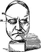Size is located just in the turn between the nose and eyebrows, or beneath the inner portion of the eyebrows; and when large, causes their inner portions to project outward over the inner portion of the eyes like the eaves of a house, giving to the eyes a sunken appearance. Size can generally be observed by sight, yet if you would test your sight by touch, proceed as follows: Place the end of your thumb against the bridge of your nose, with the lower part of your hand turned outward, and your thumb lying nearly parallel with the eyebrows, and the balls of your thumb will be upon Size. And if this organ be large, you will observe a fullness in this region, as if half a bean were beneath your thumb.