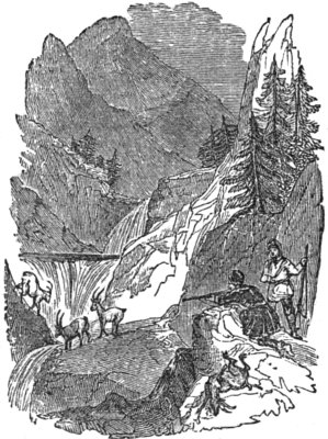 Hunter. I will tell you an anecdote, by which you will see that hunters and trappers have need to be men of courage and activity. A trapper, of the name of Cannon, had just had the good fortune to kill a buffalo; and, as he was at a considerable distance from his camp, he cut out the tongue and some of the choice bits, made them into a parcel, and slinging them on his shoulders by a strap passed round his forehead, as the voyageurs carry packages of goods, set out on his way to the camp. In passing through a narrow ravine, he heard a noise behind him, and looking round, beheld, to his dismay, a grizzly bear in full pursuit, apparently attracted by the scent of the meat. Cannon had heard so much of the strength and ferocity of this fierce animal, that he never attempted to fire, but slipping the strap from his forehead, let go the buffalo meat, and ran for his life. The bear did not stop to regale himself with the game, but kept on after the hunter. He had nearly overtaken him, when Cannon reached a tree, and throwing down his rifle, climbed up into it. The next instant Bruin was at the foot of the tree, but as this species of[26] bear does not climb, he contented himself with turning the chase into a blockade. Night came on. In the darkness, Cannon could not perceive whether or not the enemy maintained his station; but his fears pictured him rigorously mounting guard. He passed the night, therefore, in the tree, a prey to dismal fancies. In the morning the bear was gone. Cannon warily descended the tree, picked up his gun, and made the best of his way back to the camp, without venturing to look after his buffalo-meat.