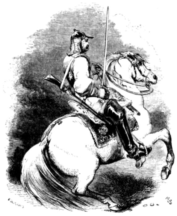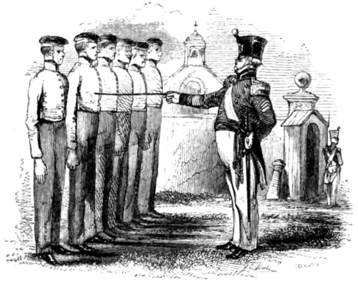 “Indeed he has, but he very soon effects a 5change in their appearance. The first thing the recruit has to learn is to stand in a proper position. Then come facing, stepping, and marching, filing, wheeling, and with the manual and platoon exercise, forming; and, if in the cavalry, saddling, bridling, mounting, riding, and leaping, with the manœuvres of troops and squadrons, companies, battalions and regiments. What with carbine and pistol exercise, sword exercise and lance exercise, with parade, mounting guard, and keeping accoutrements, and perhaps, a horse in order, a soldier has many duties to perform.”