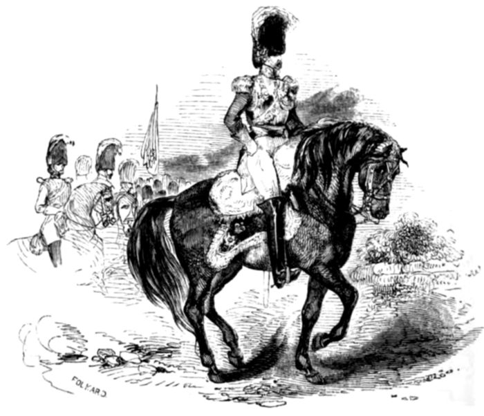 “In the narrative of Sir John Moore’s campaign is given the following account of a charge made on the French imperial guards, who were thought 316to be almost invincible, by Lord Paget and the 10th hussars. At nine o’clock A. M. five hundred or six hundred of the imperial guard plunged into the river and crossed over; they were immediately opposed by the pickets under Colonel Otway, which, when united, amounted only to two hundred and twenty men. They retired slowly before the enemy, bravely disputing every inch of ground; and upon the pickets being reinforced by a small body of the 3rd dragoons, they charged with so much fury that the first squadron broke through, and was for a time surrounded by the enemy; wheeling up, they extricated themselves by charging back through the enemy. Lord Paget soon reached the field with the 10th hussars; and having drawn the French from the river, he charged the whole body; but before the British could close the chasseurs wheeled about, and fled to the ford, leaving on the field fifty-five killed and wounded, and seventy prisoners; among whom was General Lefebre. The imperial guards showed themselves much superior to any cavalry which the British had before engaged; they fought gallantly, and killed or wounded near fifty of our dragoons. It has been said, that, next to the Duke of Wellington, no man contributed more to the success of the battle of Waterloo than the Marquess of Anglesey, who has been styled the ‘first cavalry officer in the world.’ By his gallantry and dash, he excited the admiration and kindled the spirit of his troops! 317Twice had the marquess, then Earl of Uxbridge, led the guards to the charge, cheering them with the cry of, ‘Now for the honour of the household troops,’ when three heavy masses of the enemy’s infantry advanced, supported by artillery and a numerous body of cuirassiers. The Belgians fled; the Highland brigade received the shock. The moment was critical; the Earl of Uxbridge galloped up to the second brigade, which received him with a cheer. The three regiments presented a front of about thirteen hundred men; he placed himself at their head, and made one of the most rapid and destructive charges ever witnessed. The division they attacked consisted of more than nine thousand men; only about a thousand of these escaped, under cover of the cuirassiers; for of the remainder three thousand were made prisoners, and five thousand slain. One of the last shots that were fired struck him on the knee, and thereby occasioned the loss of his leg.”