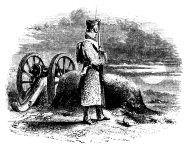 “True. They work hard, play hard, and fight hard; but, say what you will, it is not all sunshine with soldiers and sailors. A soldier, on 6parade or on a review day, looks like a man of leisure, and in time of peace he is not overdone with his duty; but see him in war, marching through miry roads, panting with heat or numbed with cold, up early and late, sleeping on the bare ground in his wet clothes:—hunger pinches him, fatigue wears him, and the stormy fight with all its dangers awaits him,—yet, on he goes without a murmur.