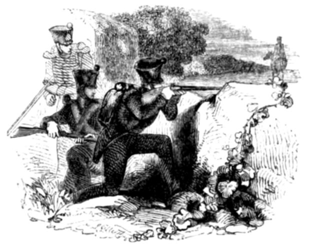 “I should have told you before of Colonel 318Colborne, afterwards Sir John Colborne, commander-in-chief in Canada. When he commanded the second brigade of rifles at the storming the heights of Beira in Portugal in 1813, he charged the enemy, who fled to the mountains. It was an odd circumstance, but so it occurred, that pushing on round a hill, with only his brigade-major and a few riflemen—for he had shot ahead of the rest of the troops—to his great surprise, he found that he had got before three hundred retreating Frenchmen.”