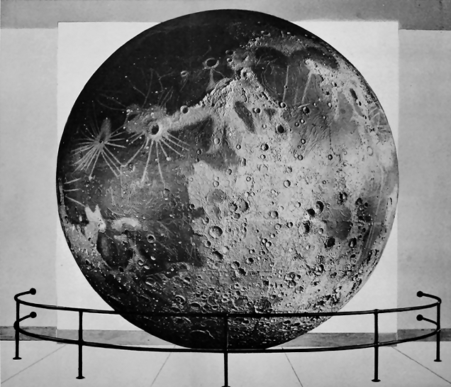 PHOTOGRAPH OF MODEL IN RELIEF OF THE VISIBLE HEMISPHERE OF THE MOON. HALL 35. The model is 19 feet in diameter. |