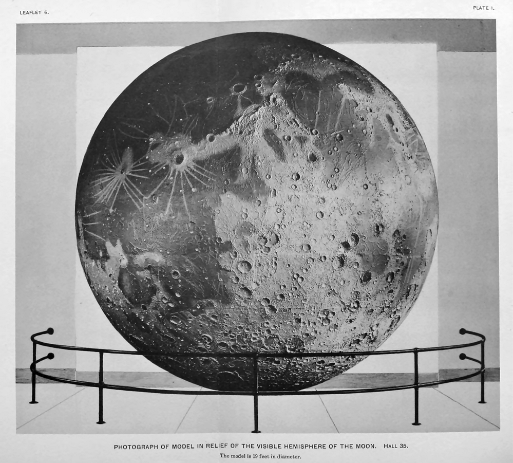 In order to represent in a vivid and accurate manner the character and appearance of the Moon's surface, the construction of a large model of the Moon was undertaken a number of years ago by Th. Dickert, Curator of the Natural History Museum of Bonn, Germany and Dr. J. F. Julius Schmidt, Director of the Observatory of Athens, Greece and an eminent selenographer. - 3 - The model was presented to the Museum by the late Lewis Reese of Chicago, and is installed at the west end of Hall 35 of the Museum. The model is 19.2 feet in diameter, and is by far the largest and most elaborate representation of the Moon's surface ever made. Its horizontal scale is 1:600,000, one inch on the model equaling 947/100 miles on the surface of the Moon, and its vertical scale is 1:200,000, one inch equaling 315/100 miles on the Moon.