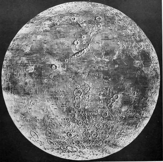 Except for occasional comets and meteors, the Moon is the celestial body nearest the Earth. Its mean distance from the Earth is 237,640 miles, but as it moves in an elliptical orbit, it has at one point a remoteness of 253,263 miles and opposite to this one of 221,436 miles. The diameter of the Moon is about one-fourth that of the Earth, or 2,160 miles, and its volume is 1/49 that of the Earth. The mass of the Moon (volume multiplied by density) is 1/81 and the density ⅗ that of the Earth. The period of the Moon's revolution about the Earth is 27 days, 7 hours, 43 minutes and 11½ seconds. As its period of rotation on its axis is the same, only one side of the Moon is ever seen from the Earth. Since, however, the Moon's axis is inclined about 83° to the plane of its orbit, we sometimes see a little distance beyond each of its poles, and, since the rate of motion of the Moon in its orbit varies slightly, we sometimes see a little beyond the eastern and western edges of the hemisphere. The total result of these librations, as they are called, is to make four-sevenths of the Moon's surface visible to us. Of the remaining three-sevenths, nothing is known. So far as is known, the Moon is not flattened at the poles.