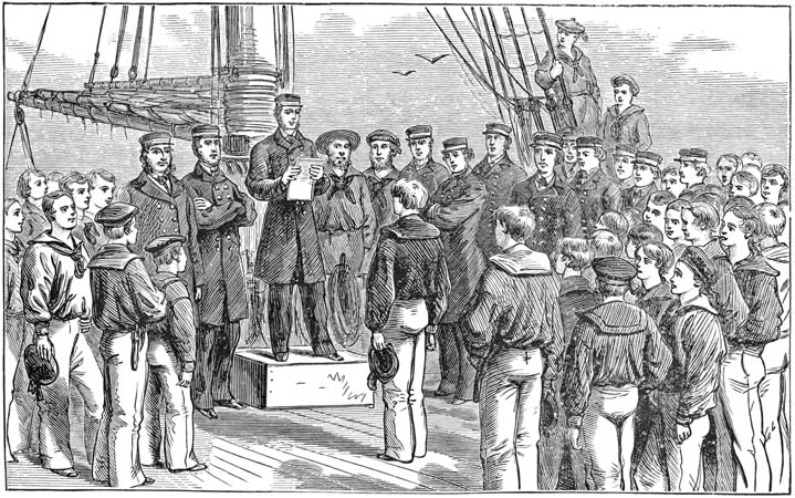 “Young gentlemen,” Mr. Lowington began, “I am well aware that the changes proposed to-day will amount to a revolution. About the middle of the month, after the new crews of the several vessel have been trained to their duties under the different order of things, the squadron will sail for Brockway, the former headquarters of the fleet. When we have obtained a new register for the Ville d’Angers, she will be called the Frisbone.”