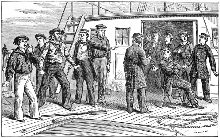 Quite as pleasant as the rides in the carriages were the excursions made in the boats of the fleet. On one occasion all the boats of the squadron, sixteen in number, made an excursion to the dock-yard. In the waters of Grassy Bay they gave an exhibition of the skill of the students in handling the cutters, which drew cheers of approbation from the naval officers and others who witnessed it. When the display was over, the boats’ crew visited the dock-yard, and one of the men-of-war in port. They were courteously shown all over the yard, and the operation of the floating-dock was explained to them.