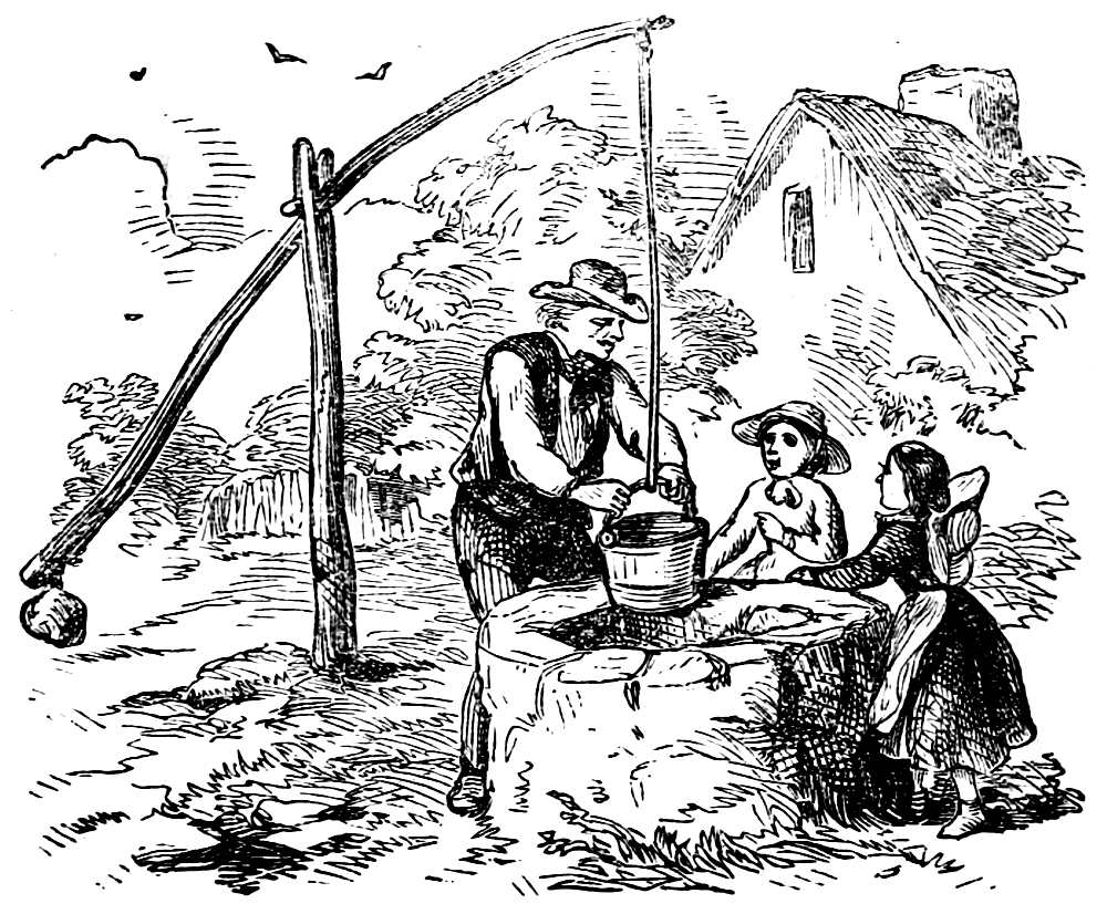 “That is rather too hard work for such little girls,” said he, as he pulled down the sweep, and then drew up the bucket full of water.