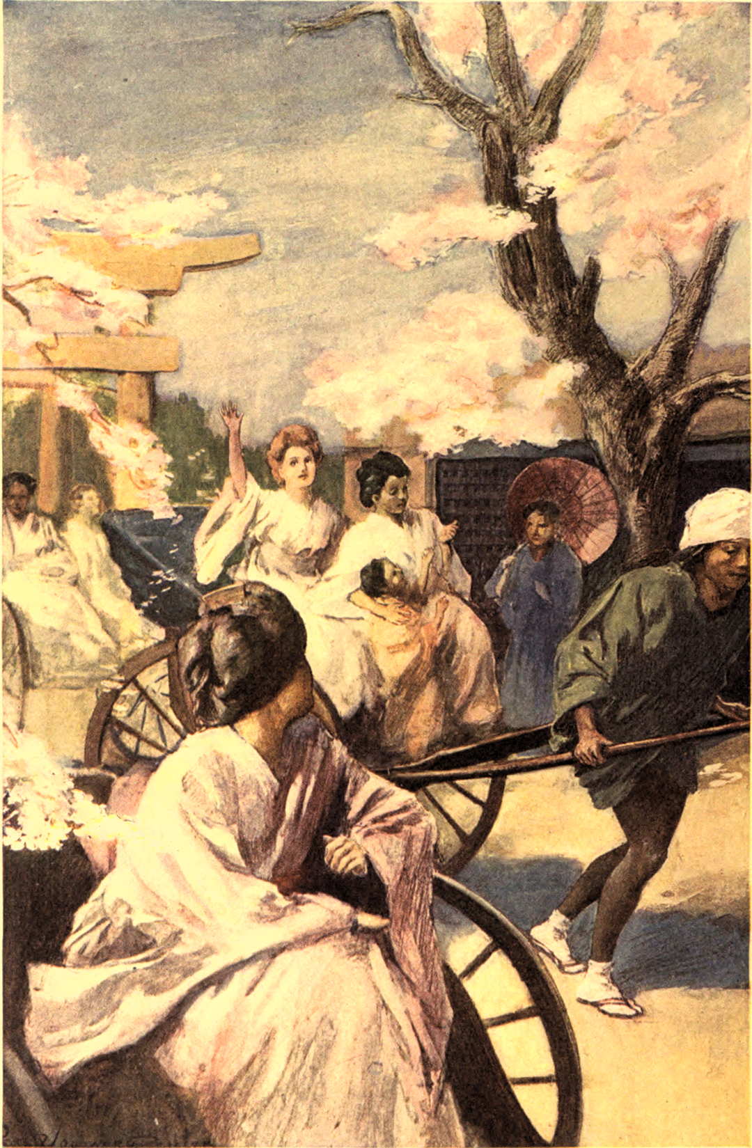Plum Blossom wore a corset outside her kimono. Some one had told her that this was the most important article of a barbarian woman’s wardrobe, and the tighter it was the better. So the little Japanese girl had tied herself by the corset-string to a post. By dint of hard pulling she had managed to encase her plump form so tightly that she could scarcely breathe. Iris, with hands clad in large kid gloves, was drawing on a pair of number five shoes. Her feet were those of the average American child of seven or eight years. At this juncture Miss Summer (who being engaged to Gozo was always called “Miss” by the little girls) opened the shoji and thrust a flushed and excited face between the partitions. She was six months older than when she had wailed aloud her determination not to wash the feet of a barbarian mother-in-law, but she seemed as childish and silly as ever as she came tittering into the room, an enormous straw hat, from which dangled ribbons and bedraggled ostrich-feathers, upon her head. The sisters gasped in admiration, their eyes purple with envy and wonder. Only in pictures had they seen anything so gorgeous as that hat.