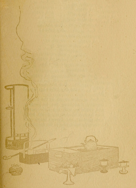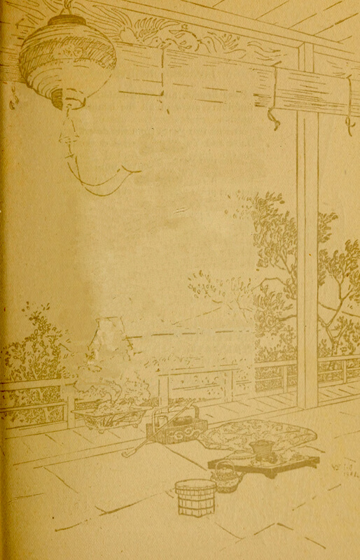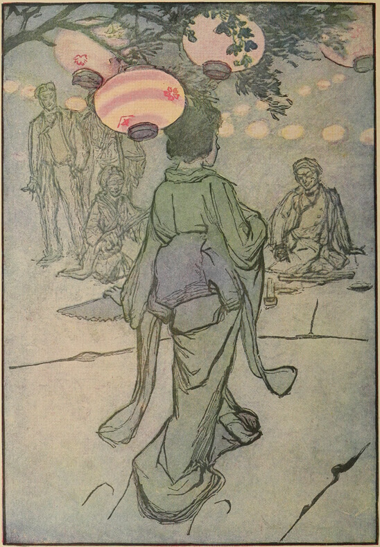 The seekers of pleasure who made [pg 3] their way out to the little island on this night moored their boats here in the shadows beneath the trees, and drove in fairy vehicles, pulled by picturesque runners, clear around the island, under the pine-trees, over miniature brooks, into the mysterious dark of a forest. Suddenly they were in a blaze of swinging, dazzling lights, laughter and music, chatter, the clattering of dishes, the twang of the samisen, the ron-ton-ton of the biwa. They had reached the garden and the tea-house.