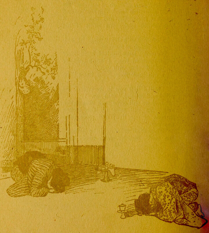 But the beauty of Matsushima could give him no peace of mind or soul, for he was alone! The stillness and silence of the very atmosphere, the tall pine-trees, bending gracefully in the [pg 201] swaying, swinging breezes, seemed to mock him with their calm content. The bay was enchanted—yes, but haunted too—haunted by the imagination of the little feet that had perhaps wandered along its shore.