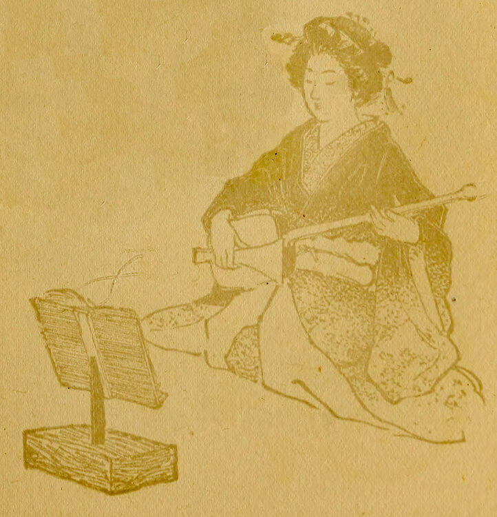 Meanwhile the nerve-scraping dzin, dzin, dzin of a samisen was disturbing the air with teasing persistence. There is something provoking and still alluring in the music of the samisen. It startles the chills in the blood like the maddening scraping of a piece of metal against stone, and still there [pg 8] is an indescribable fascination and beauty about it. Now as it scratched and squealed intermittently and gradually twittered down to a zoom, zoom, zoom, a voice rose softly, and gently, insinuatingly, it entered into the music of the samisen. Only one long note had broken loose, which neither trembled nor wavered. When it had ended none could say, only that it had passed into other notes as strangely beautiful, and a girl was singing.