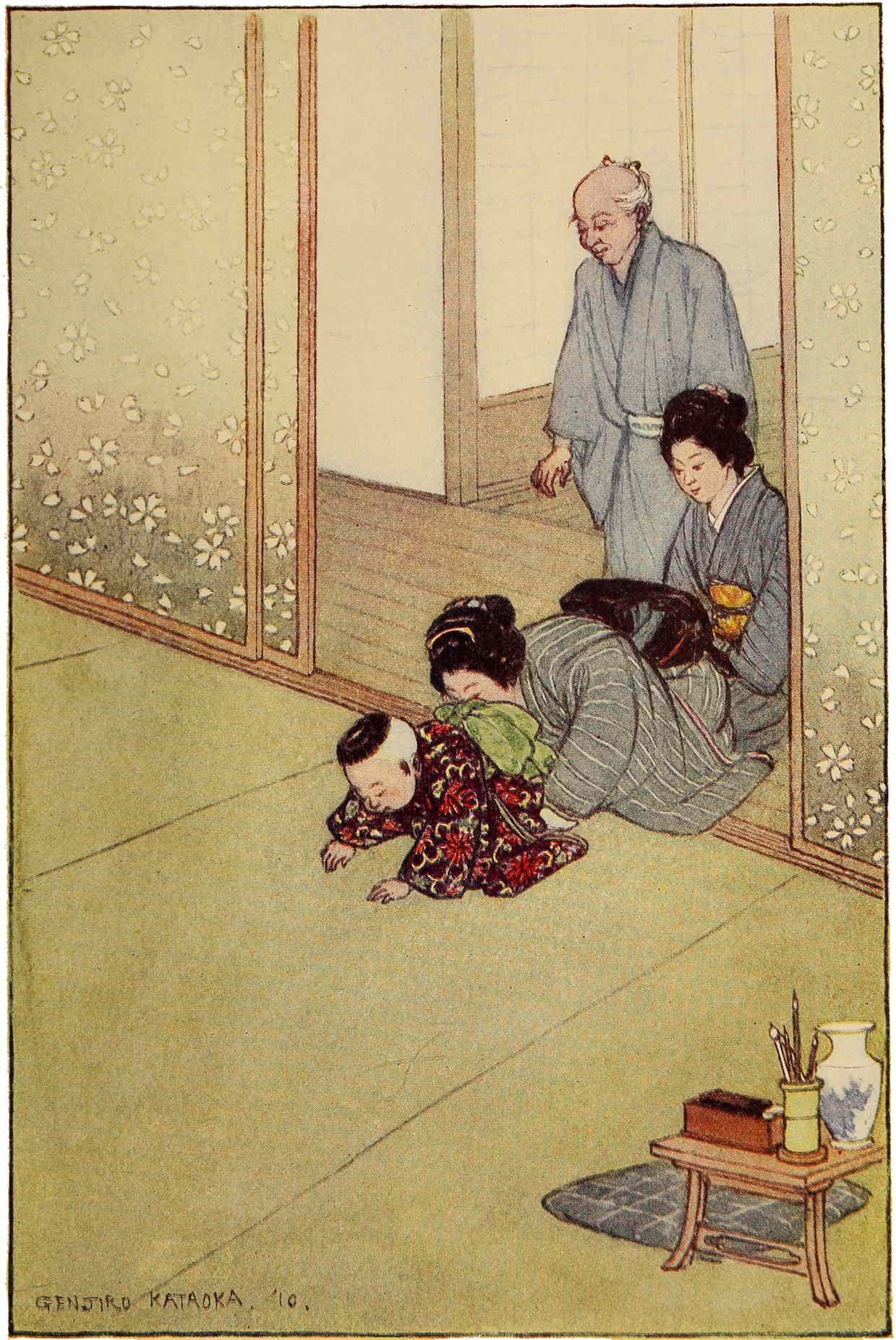 Even the individual members of his household had dispersed. They had come in one by one in solemn procession, led by the samourai guard, who, as they prostrated themselves, sucked in their breath fiercely, expelling it in long, sibilant hisses. The cook, his assistants, and wife and family formed a small procession of their own, one behind the other, executing a series of such comical bows and bobs that the stern lips of the Tojin-san had softened in spite of himself, particularly so, when the tiniest one, a toddling baby no more than two years old, had solemnly brought its diminutive shaven pate to the floor, and had almost capsized in a somersault in its efforts to emulate its elders’ politeness.