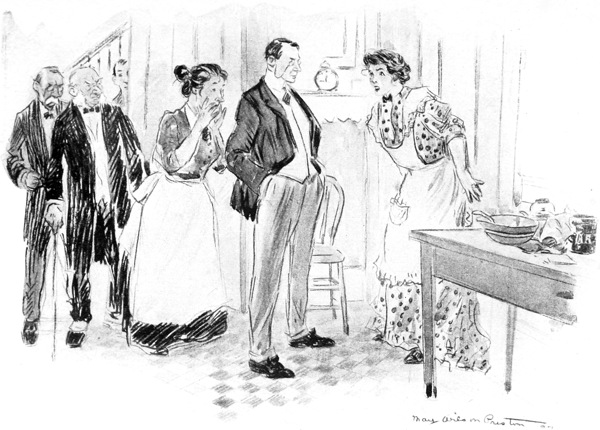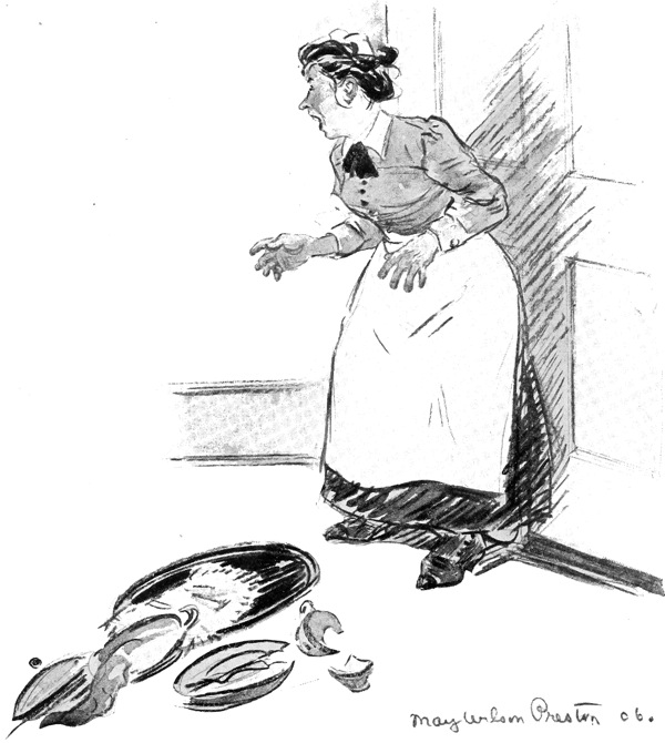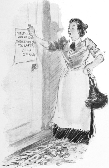 By and by I heard Miss Claire go into the dining-room and I let her ring the table bell awile befure ansering. Her payshunce gitting the better of her sense she pokes her hed into me kitchen. Now I happened to be standing neerby the dure, wayting for further ivints. Well, as I sed, out popped Miss Claire’s hed throo the dure which banged against me own, while me frying-pan wint flying up on hers.