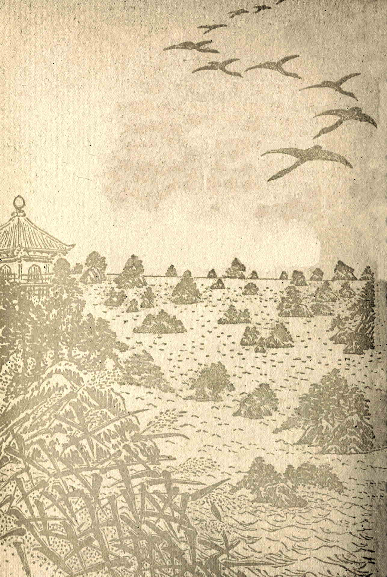 Near to Sendai there is a bay called Matsushima. Here Nature has flung out her favors with more than lavish hand; for throughout the bay she has scattered jewel-like rocks, whose white sides rise above the waters, and whose surface gives nutrition to the graceful pine-trees which find their roots within the stone. Near to a thousand rocks they are said to number, and save for the one called Hadakajima, or Naked Island, all are crowned with pine-trees.