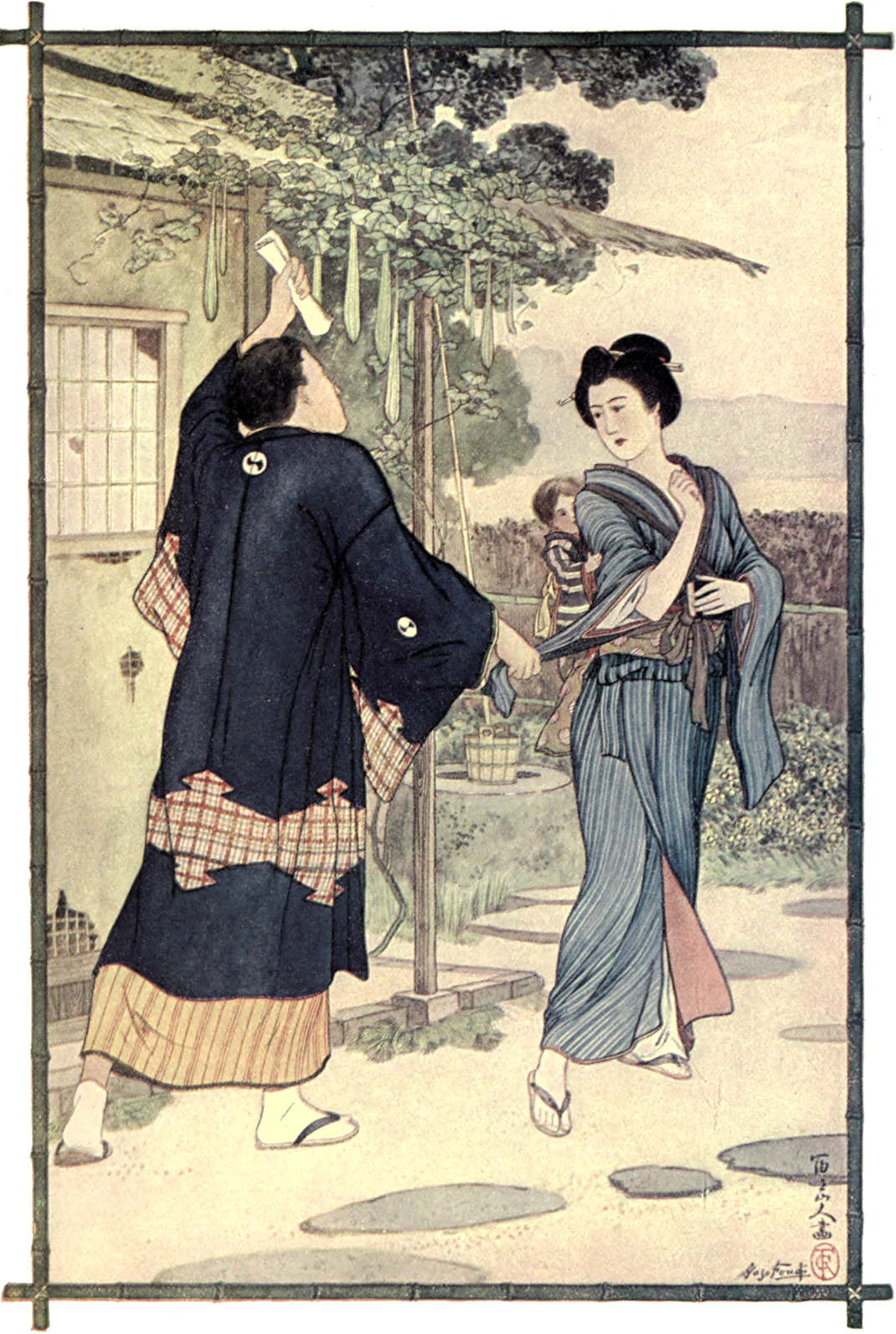 15“Here they come!” cried Koto. The girls fell into an excited little line by the church door, one behind the other. Out came the choir—their surplices doffed, their washed faces wide with smiles and their little eyes shining. Five sen rattled in the sleeve of each. The girls had drawn in hiding behind the church portico in order to surprise them. Now they sprang out into view, and grasped the boys by the sleeves. Thinking they were being set upon for their hard-earned sen, a series of angry shrieks and snorts burst out. Their fears set at rest by the merry laughter of the girls, they were finally induced to tell all they knew. The minister, it seems, had 16brought them to his house at various times, had fed them on sweet potatoes and rice cakes, and had taught them to sing just as he did. For this public effort in his temple, he had given them each—well, they did not propose to tell any one how much he had given, but the intimation was that it was a sum sufficient to keep them in luxury for some time to come. Furthermore, they, the members of his choir, were to have this same sum given to them as a weekly income, for singing, just like the white priest, in his church, each Sunday.