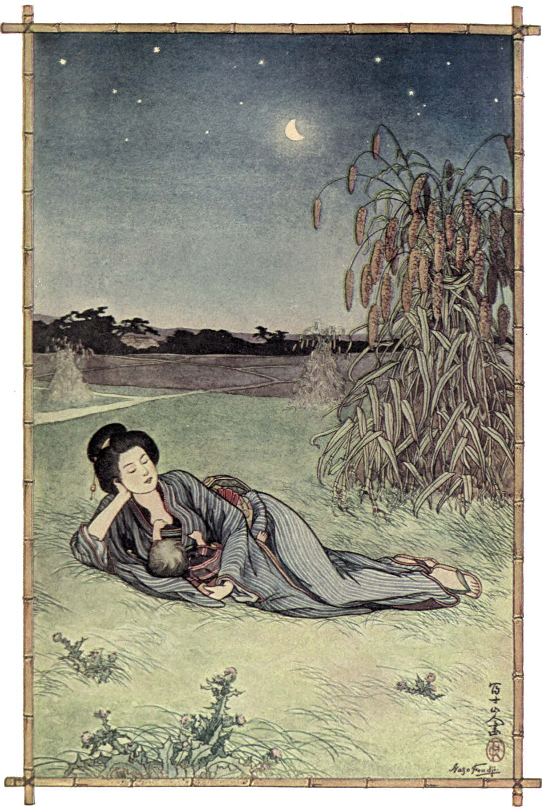 238He started up with a loud cry. A moment only, and he was beside her, his trembling hands touching her. Something stirred upon her back and he saw the round head of the baby. Its eyes were wide open now and looking at him with interest. Like most Japanese babies, it was a grave, mute little mite, but its eyes were large and, like his own mother’s, blue in color. He knew it for his own child, though he could not see the face of the mother who lay so very still. Some blessed instinct guided his staggering feet to the door. He aroused the sleeping Gonji, and put into his arms the child. Then he went back into the church.