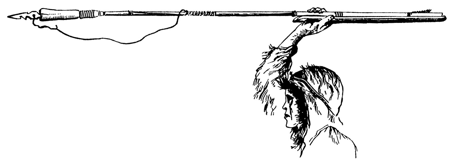 Fig. 1. Eskimo launching a seal harpoon by means of the throwing-stick. Mr. John Murdoch states that the hand is held much lower by the Point Barrow Eskimo, the harpoon resting as low as the shoulder, and that the movement of throwing the harpoon is quick, as in casting a fly in fishing.