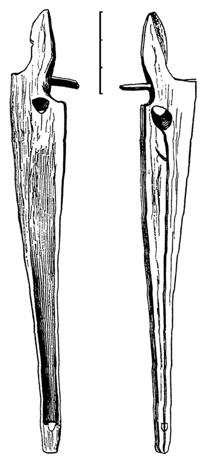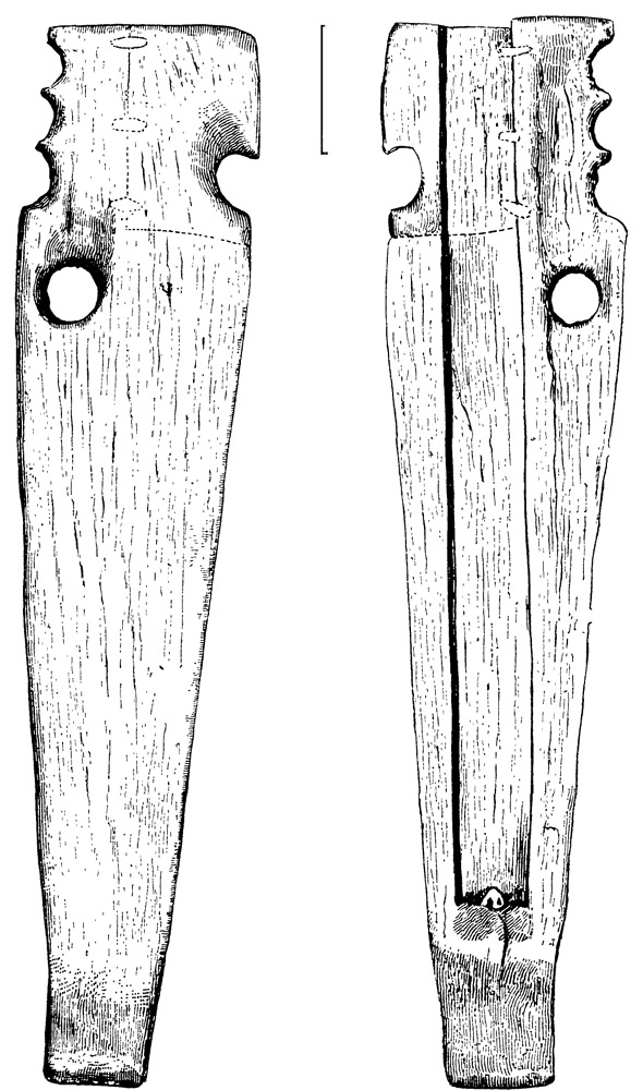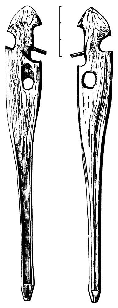 Fig. 11. Norton Sound type, two-pegged variety. In all respects, excepting the number of pegs, this resembles Figs. 9 and 10. In all of them the peg at the bottom of the groove is very clumsy. Collected in Norton Sound, by E.W. Nelson, in 1878. Museum number, 32995.