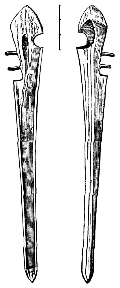 9. Hook or spur, provision for seizing the butt end of the weapon while it is being launched. These may be ridges left in the wood by excavation, or pieces of wood, bone, ivory, &c., inserted. The size and shape of this part, and the manner of insertion, are also worthy of notice.
