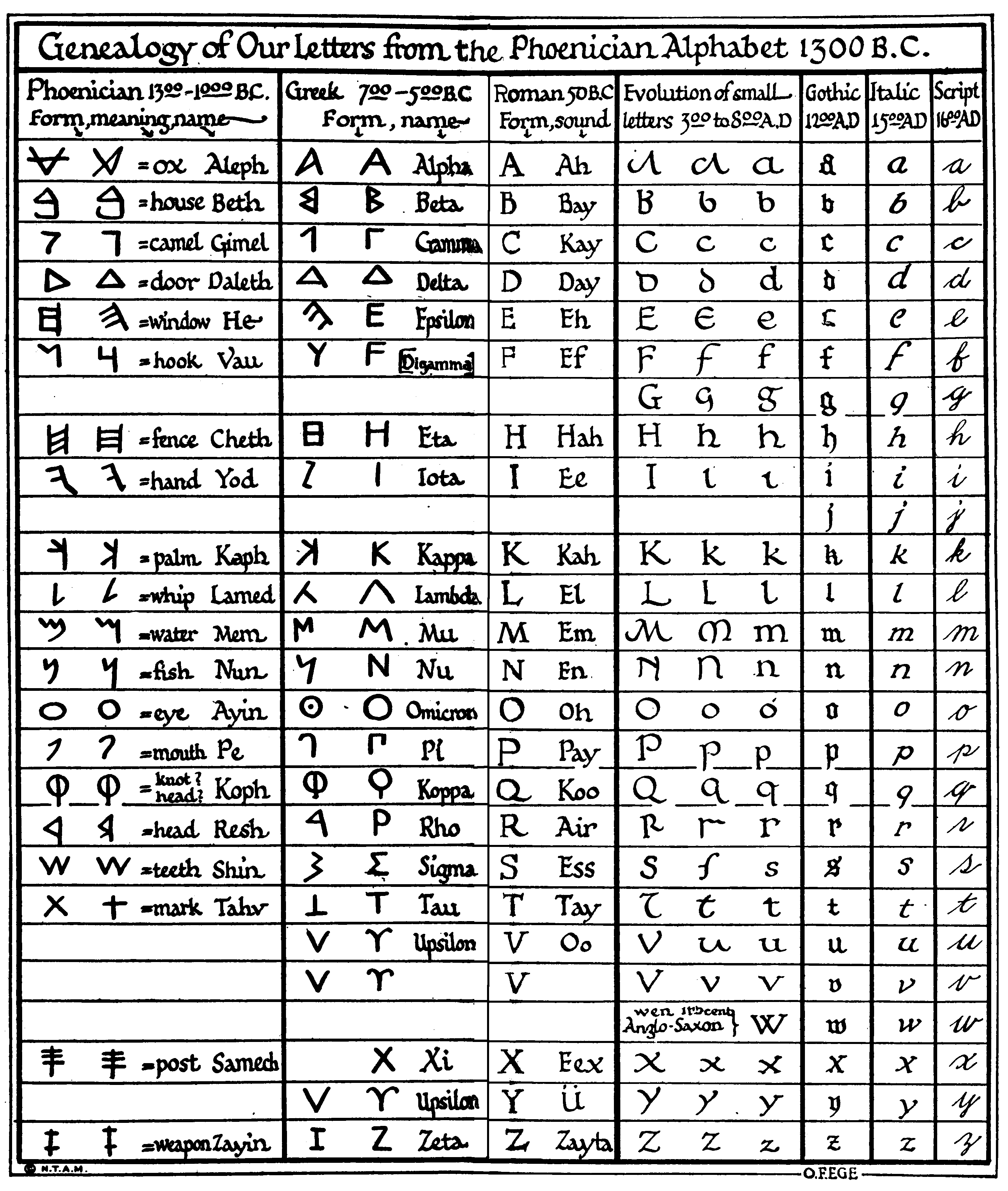 The few characters selected by the Phoenicians, the great traders, artificers and farmers of the ancient world, not only influenced Greek literature and life, Roman and modern nations in Europe, but also spread eastward to the very walls of China. The Hebrews copied them as a whole and retained the original names with only slight variations. They did change the shapes because a different writing instrument was employed.