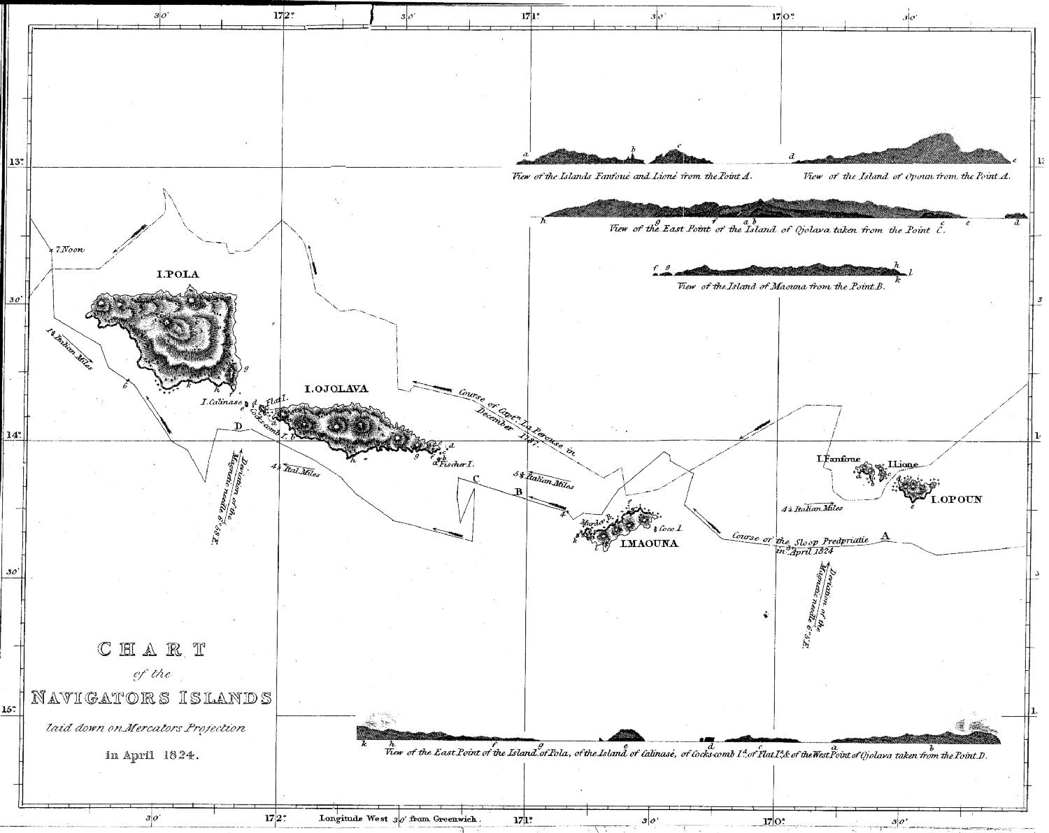 With respect to our geographical observations on the Navigators' Islands, I must make one remark—that all the longitudes found by us differ from those of La Pérouse by from 20 to 23', and the points observed lying so many miles more easterly than he considered them. His observations were grounded on the distance of the moon, which always gives a false longitude unless there is an opportunity of seeing the moon at equal distances, right and left, from the sun. Our longitudes were fixed by good chronometers, which having been regulated at Cape Venus, could not in so short a time have made any important error.