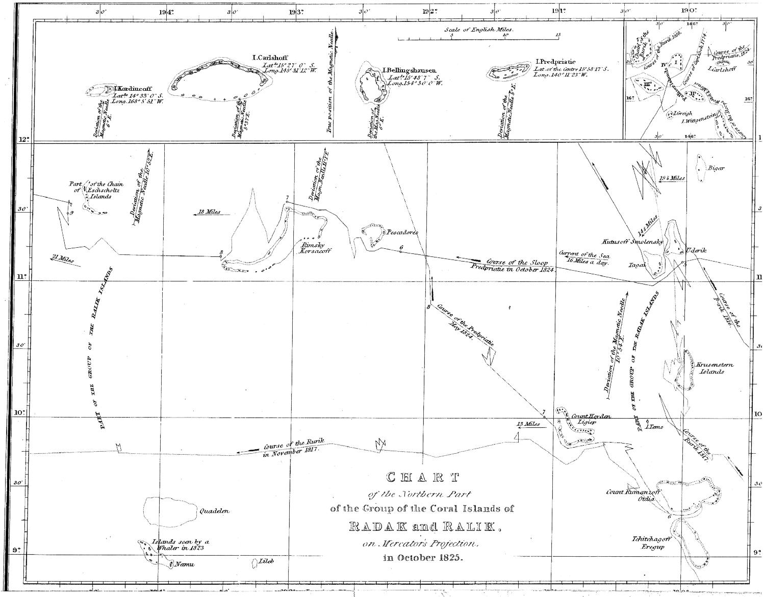 In the year 1816, in the ship Rurik, I discovered the chain of islands called by their inhabitants, Radack. It consists of several groups lying near each other, and these again of many small islands united by reefs and surrounding great basins of water. All these being formed by the coral insect, are very low, and still but thinly covered with soil, so that they want the luxuriance of vegetation usual in this climate; their population is scanty; and the most important island of a group commonly gives its name to the whole.