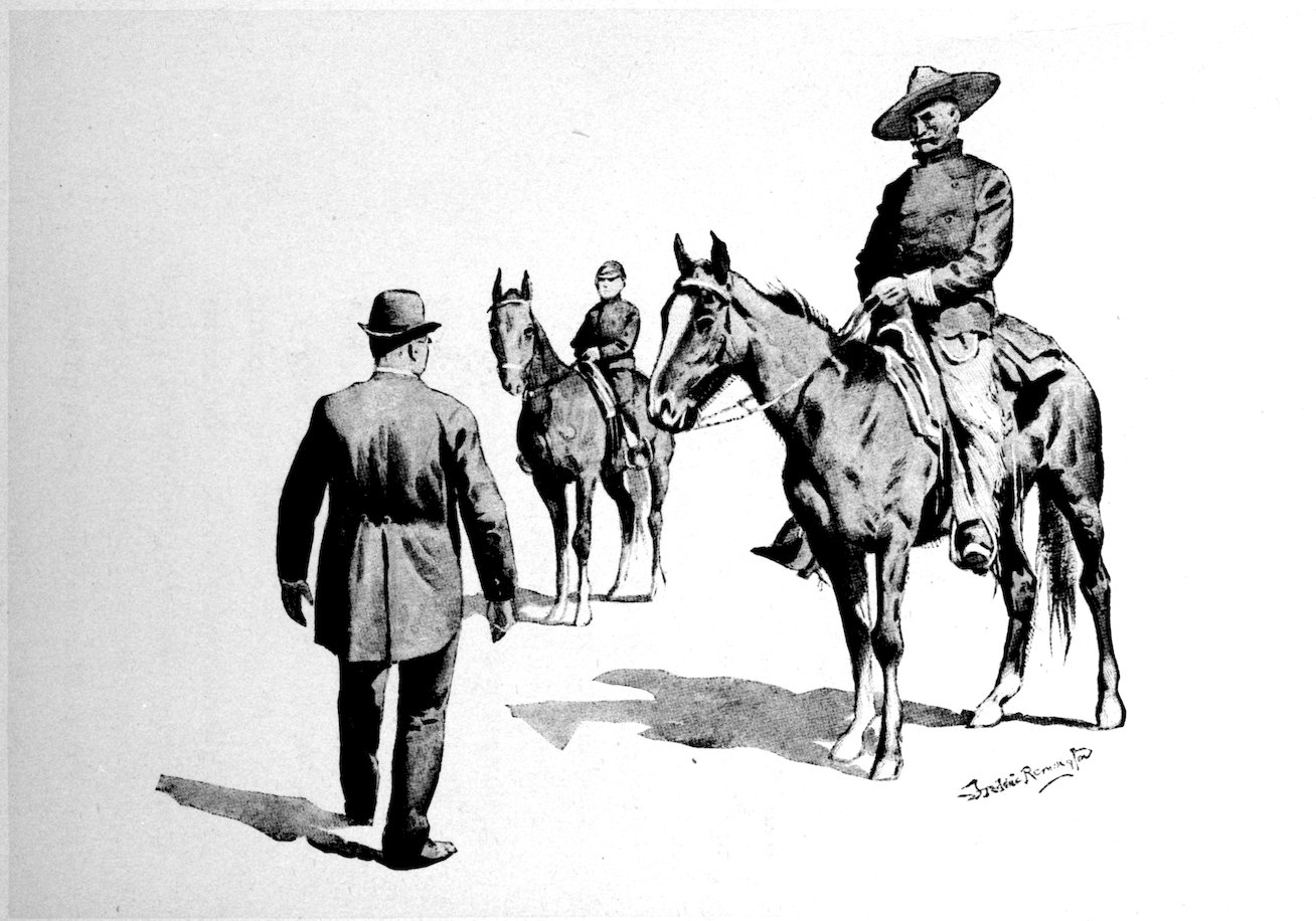The Governor descended the steps of the Capitol slowly and with pauses, lifting a list frequently to his eye. He had intermittently pencilled it between stages of the forenoon’s public business, and his gait grew absent as he recurred now to his jottings in their accumulation, with a slight pain at their number, and the definite fear that they would be more in seasons to come. They were the names of his friends’ children to whom his excellent heart moved him to give Christmas presents. He had put off this regenerating evil until the latest day, as was his custom, and now he was setting forth to do the whole thing at a blow, entirely planless among the guns and rocking-horses that would presently surround him. As he reached the highway he heard himself familiarly addressed from a distance, and, turning, saw four sons of the alkali jogging into town from the plain. One who had shouted to him galloped out from the others, rounded the Capitol’s enclosure, and, approaching with radiant countenance, leaned to reach the hand of the Governor, and once again greeted him with a hilarious “Hello, Doc!”