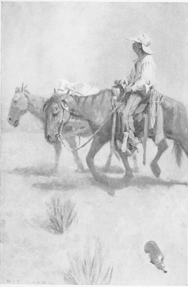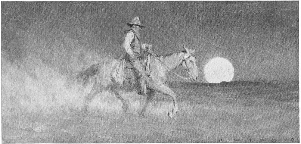 From the West the tenderfoot took home with him the health he had sought, and an enthusiasm{14} his friends fled from; what was Wyoming to them or they to Wyoming? In 1885 the Eastern notion of the West was “Alkali Ike” and smoking pistols. No kind of serious art had presented the frontier as yet. Fresh visits but served to deepen the tenderfoot’s enthusiasm and whet his impatience that so much splendid indigenous material should literally be wasting its sweetness on the desert air. It is likely always to be true that in each hundred of mankind ninety-nine can see nothing new until the hundredth shakes it in their faces—and he must keep shaking it. No plan of shaking was yet in the tenderfoot’s mind, he was dedicated to other calling; but he besieged the ears of our great painter and our great novelist. He told the painter of the strong, strange shapes of the buttes, the epic landscape, the color, the marvellous light, the red men blanketed, the white men in chapareros, the little bronze Indian children; particularly does he recall—in 1887 or 1888—an occasion about two o’clock in the morning in a certain beloved club in Boston, when he had been preaching to the painter. A lesser painter (he is long dead) sat by, unbelieving. No, he said, don’t go. I’m sure it’s all crude, repulsive, no beauty. But John Sargent did believe. Other work waited him; his path lay elsewhere, he said, but he was sure the tenderfoot spoke truth. Other work awaited the novelist, too; both painter and novelist were wiser than to leave what they knew to{15} be their own for unknown fields. But would no one, then, disperse the Alkali Ikes and bring the West into American art and letters?