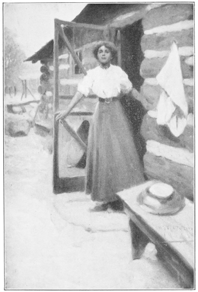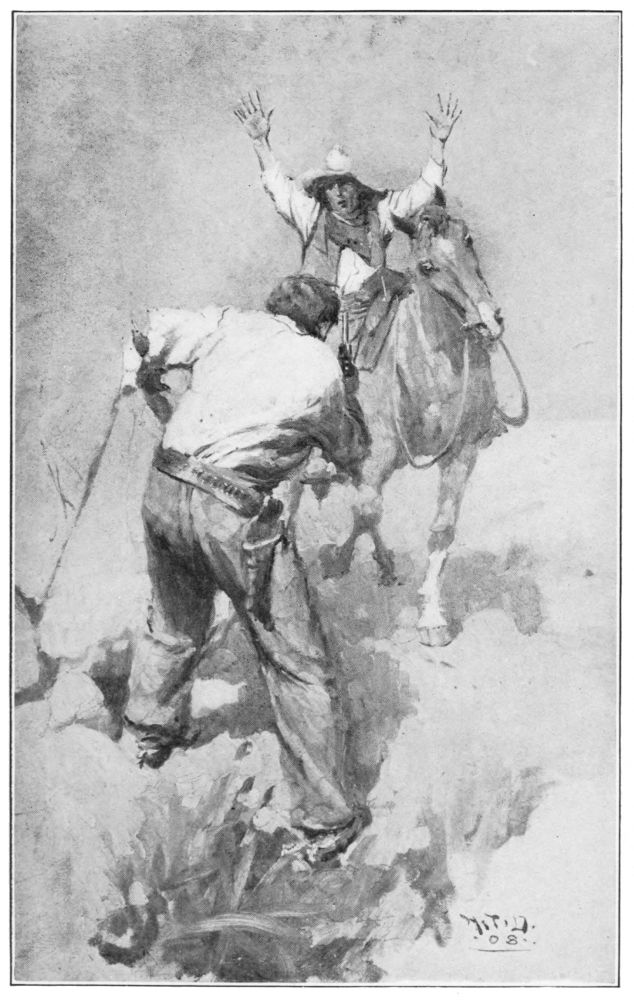 As we drew in sight of the Culloden Ranch you may imagine how I wondered what we should find there. A peaceful smoke rose from the kitchen chimney into the quiet air. Through{316} the window I saw—yes, it was May!—most domestically preparing food. Outside by the pond a figure stood. It was Jimsy. He was feeding the ducks. I swung off my horse and hurried to Jimsy. Sir Francis was eating from his hand.