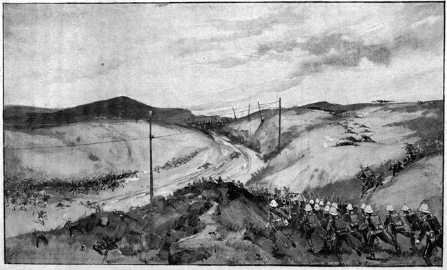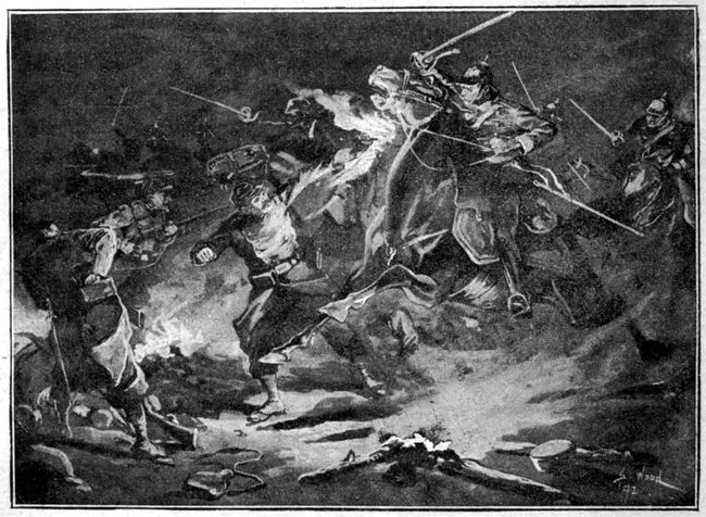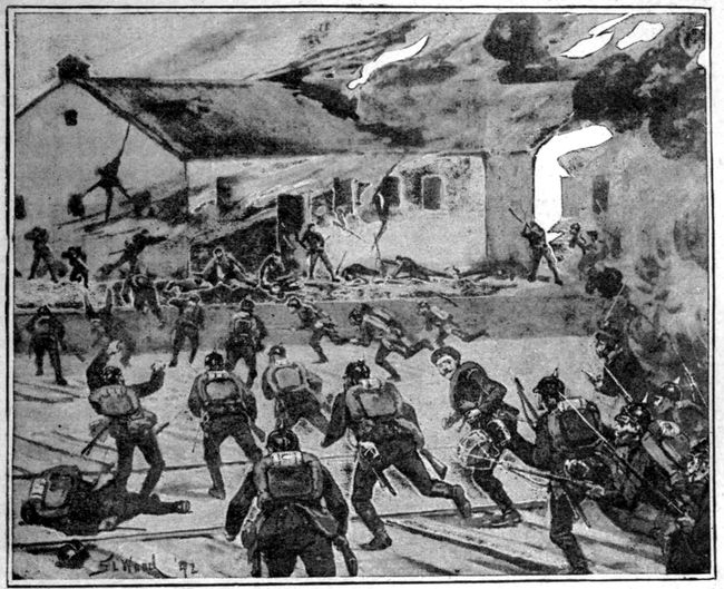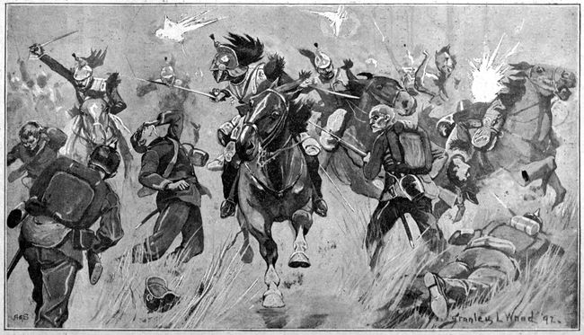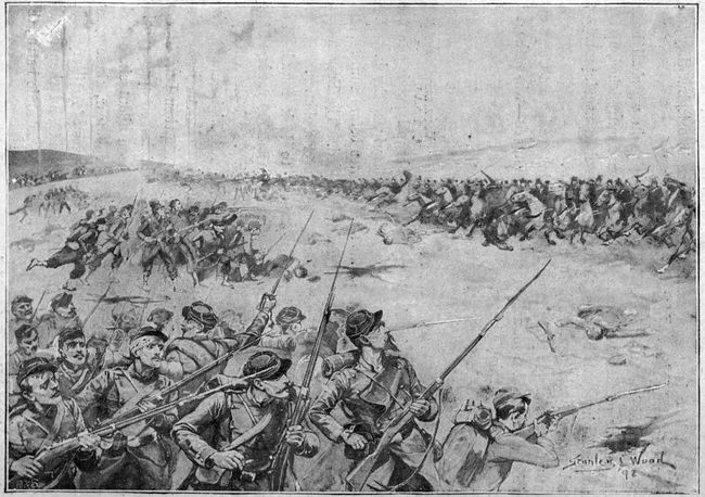 The Staff, throwing away their cigarettes, are all animation now. Officers and orderlies gallop recklessly down the hill at 273break-neck speed. There is a stir amongst those sleeping columns below. Men spring to their arms. I can hear the harsh words of command, and note the tricolours with their golden fringes given to the breeze. The long lines ascend the hill. What has happened? The enemy in front is moving to the attack: we shall hold the second ridge as we held the first. But no, it is more than this. This time, as our guns come into action all along the crest, our infantry do not halt beside them. There is no pause now. Straight down the slopes they go, the shells screaming overhead, and the little groups of tirailleurs halting alternately to deliver their biting volleys. Here, sheltered by a friendly poplar, I can look down upon the scene. ‘What worthy enemies!’ cries a little surgeon who has joined me. ‘What a struggle of heroes!’ And so it was—while life lasts I shall never forget De Galliffet’s charge. Sixty thousand men, line after line, were hurled against the German centre. And how bravely those Germans fought! And now, looking back in cold blood, how needlessly were they butchered! Exactly opposite where I stood, their infantry moved forward with even more than the precision of a parade; in little squads, but shoulder to shoulder, with all the rigidity of a birthday review. I could even see the officers halting and actually correcting the alignment. Needless to say, these living targets were riddled through and through in the very moment of their pedantic folly. In the rear, too, came lines of men, gallantly moving forward to beat of drum, with that extraordinary, high-stepping pace which excites the ridicule of the Transatlantic visitor in Berlin. How the veterans of our Civil War would have scoffed at this slave-driver’s discipline! But even the veterans of the Wilderness and Gettysburg would have admired the bravery of those devoted Teutons. At 400 yards from each other the two lines came to a standstill. Very irregular is the front; here the French are giving back, and here the German officers are driving up their stragglers; all are standing, there is no cover on that open plain; the French volleys have dissolved into fierce individual fire, and the masses sway backwards and forwards in that 274infernal din. Of a sudden, behind me, sounds the blare of trumpets and the roll of many a score of drums. De Galliffet’s reserve is coming up to decide the conflict, and as the serried lines crowned the ridge, the Germans, battling fiercely in the valley below, began to break. And then, whilst the setting sun, pouring his red rays athwart the opposing hosts and striking radiance from the golden eagles of the tricolours, sank slowly on that awful Aceldama, the French army moved onward to its triumph. Wild and exulting were the shouts that rent the air; far above the roar of battle and the clang of drum and trumpet pealed the maddening cry for vengeance, and like a tornado—with irresistible strength and order—the young soldiers of the Republic swept down to obliterate the sorrow and the shame of 1870. Not for a moment was the issue in doubt. With all the hereditary courage of their caste, the German officers died in their tracks, disdaining to give back a single foot; but the Cuirassiers were once more let loose, the General himself directing their onslaught, and before darkness fell not a single sound man in the German army but was far upon the road to Metz. Our victory is complete; as I write, the cavalry is still pushing the pursuit.