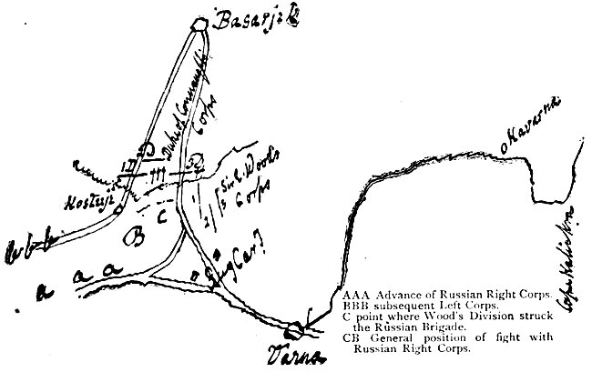 The actual disembarkation at Trebizonde occupied about a fortnight, being interrupted for about four days by a very dangerous gale, which obliged the troopers to put to sea. During all that time, however, the movement inland proceeded rapidly, thanks to the arrangements which had been previously made. The English Army advanced by rapid stages towards the neighbourhood of Erzeroum, into a position where it was able to concentrate within half a day’s march of the left flank of the position, towards which, in a short time, the Turkish Army slowly and deliberately fell back. The front of the English Army was at right angles to 291that of the Turkish, and withdrawn from it some four miles, but there was ample telegraphic communication between the two forces. A few Turkish scouts under English officers covered the front of the English. The Russians, in advancing, drove in such of these scouts as they saw. These retired as if upon the Turks. Others, withdrawn behind the features of the ground, were not observed.