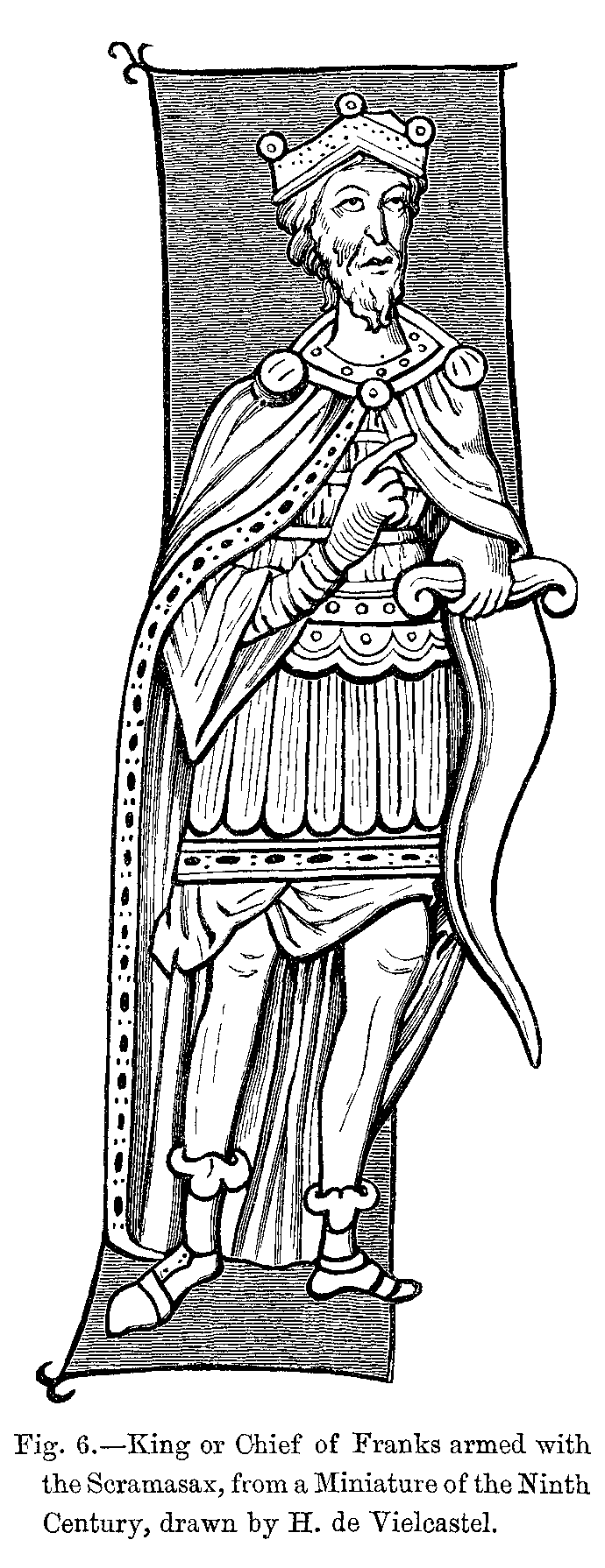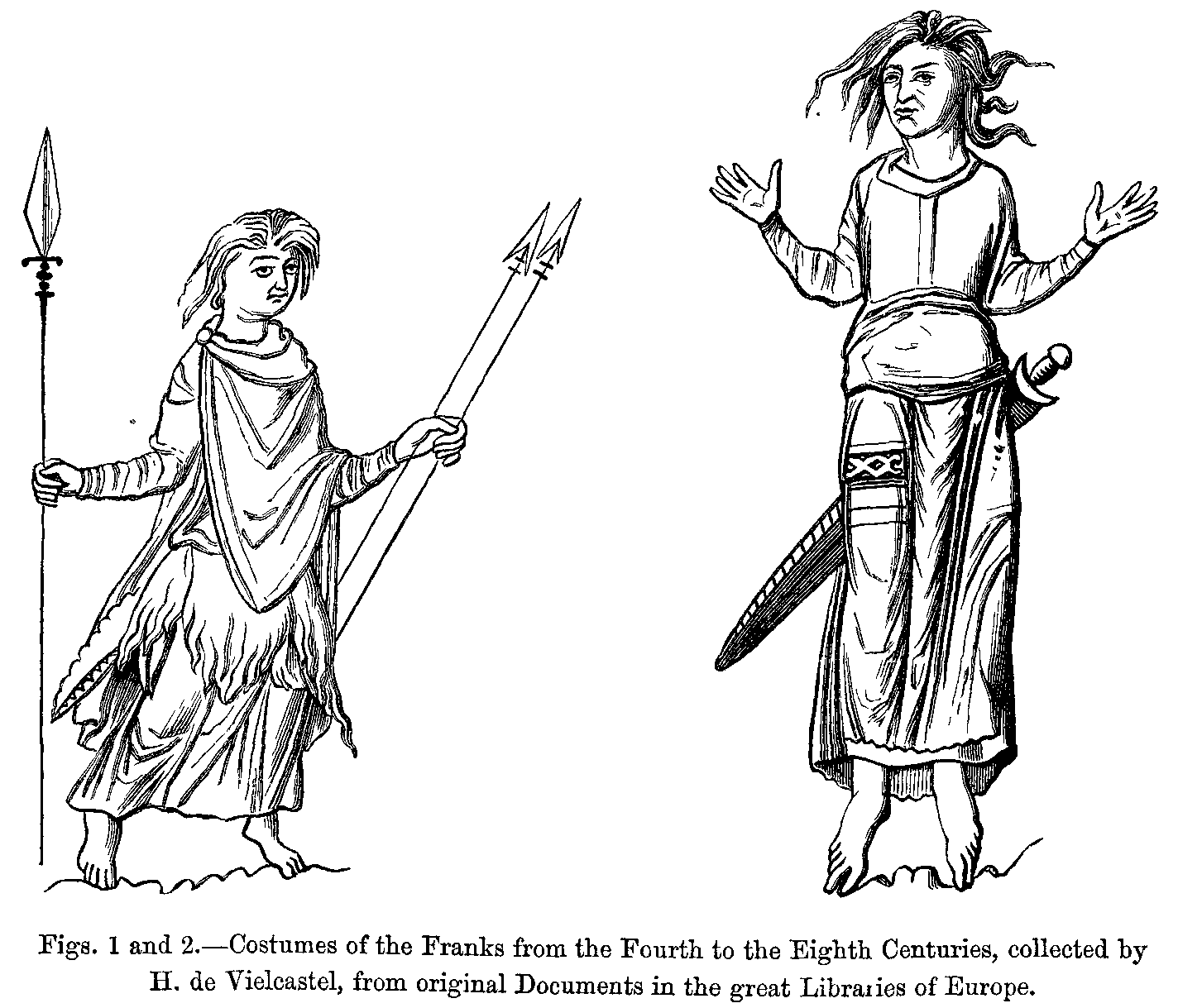 The cloak claims an equally ancient origin. The principal thing worthy of notice is the amount of ornament with which the Franks enriched their girdles and the borders of their tunics and cloaks. This fashion they borrowed from the Imperial court, which, having been transferred from Rome to Constantinople during the third century, was not slow to adopt the luxury of precious stones and other rich decorations commonly in use amongst Eastern nations. Following the example of Horace de Vielcastel, the learned author of a history of the costumes of France, we may here state that it is very difficult, if not impossible, to define the exact costume during the time of the early Merovingian periods. The first writers who have touched upon this subject have spoken of it very vaguely, or not being contemporaries of the times of which they wrote, could only describe from tradition or hearsay. Those monuments in which early costume is supposed to be represented are almost all of later date, when artists, whether sculptors or painters, were not very exact in their delineations of costume, and even seemed to imagine that no other style could have existed before their time than the one with which they were daily familiar. In order to be as accurate as possible, although, after all, we can only speak hypothetically, we cannot do better than call to mind, on the one hand, what Tacitus says of the Germans, that they "were almost naked, excepting for a short and tight garment round their waists, and a little square cloak which they threw over the right shoulder," and, on the other, to carry ourselves back in imagination to the ancient Roman costume. We may notice, moreover, the curious description given of the Franks by Sidoine Apollinaire, who says, "They tied up their flaxen or light-brown hair above their foreheads, into a kind of tuft, and then made it fall behind the head like a horse's tail. The face was clean shaved, with the exception of two long moustaches. They wore cloth garments, fitting tight to the body and limbs, and a broad belt, to which they hung their swords." But this is a sketch made at a time when the Frankish race was only known among the Gauls through its marauding tribes, whose raids, from time to time, spread terror and dismay throughout the countries which they visited. From the moment when the uncultivated tribes of ancient Germany formally took possession of the territory which they had withdrawn from Roman rule, they showed themselves desirous of adopting the more gentle manners of the conquered nation. "In imitation of their chief," says M. Jules Quicherat, the eminent antiquarian, "more than once the Franks doffed the war coat and the leather Belt, and assumed the toga of Roman dignity. More than once their flaxen hair was shown to advantage by flowing over the imperial mantle, and the gold of the knights, the purple of the senators and patricians, the triumphal crowns, the fasces, and, in short, everything which the Roman Empire invented in order to exhibit its grandeur, assisted in adding to that of our ancestors."