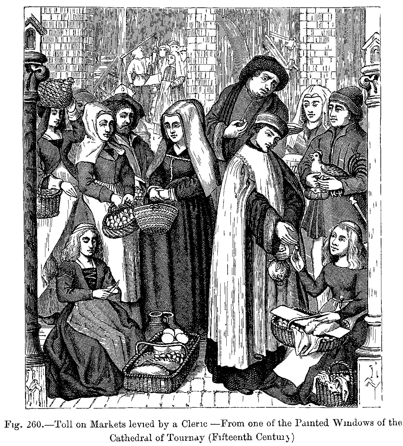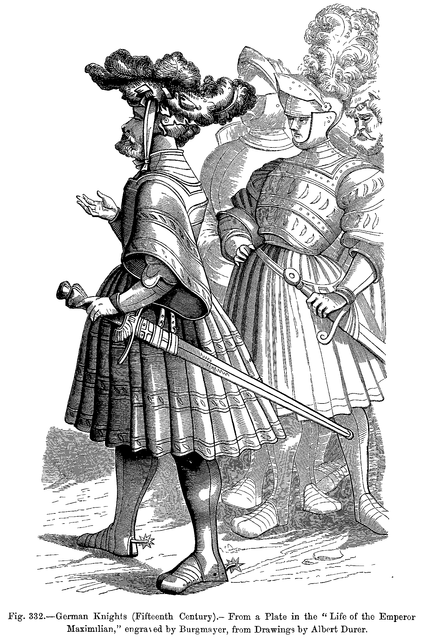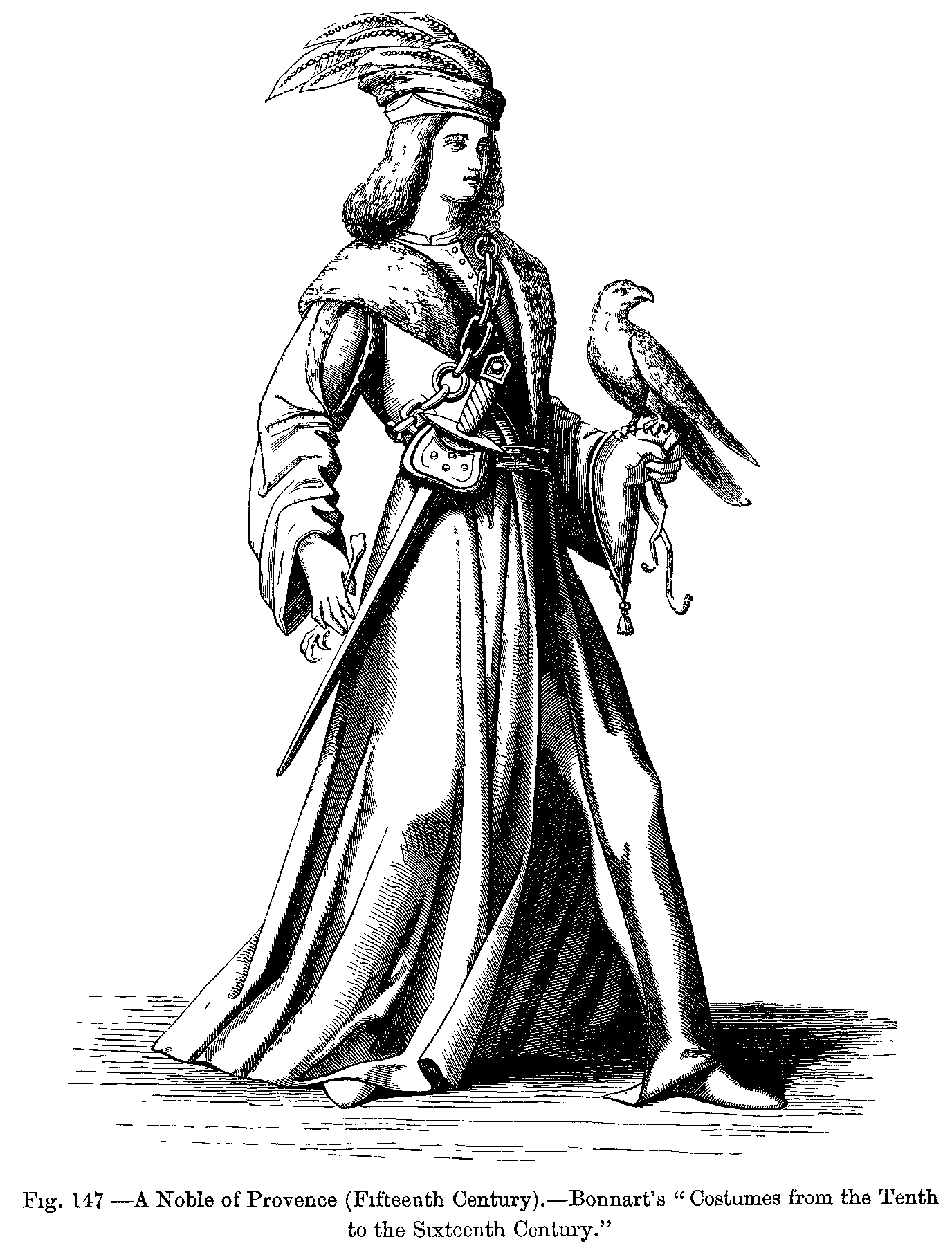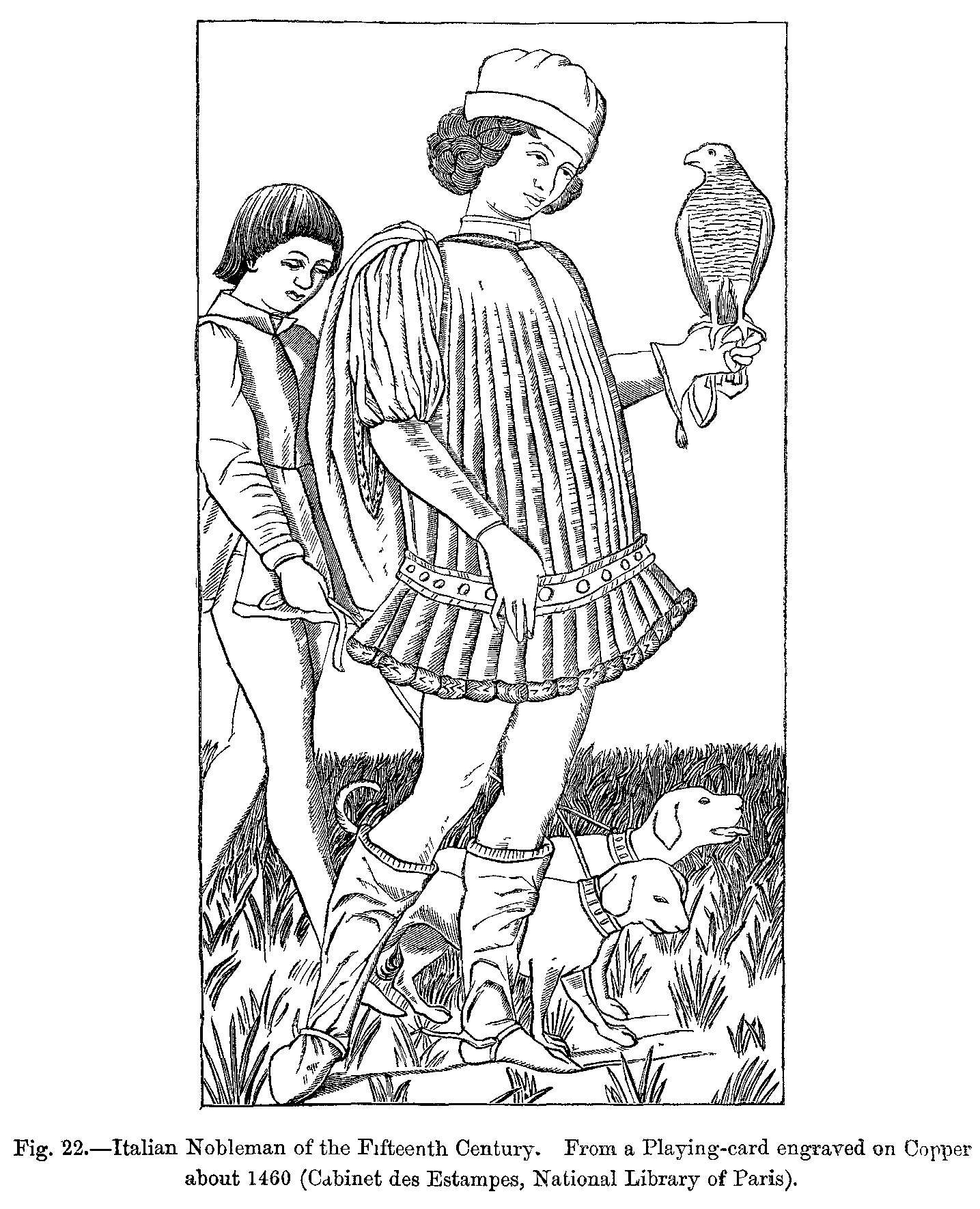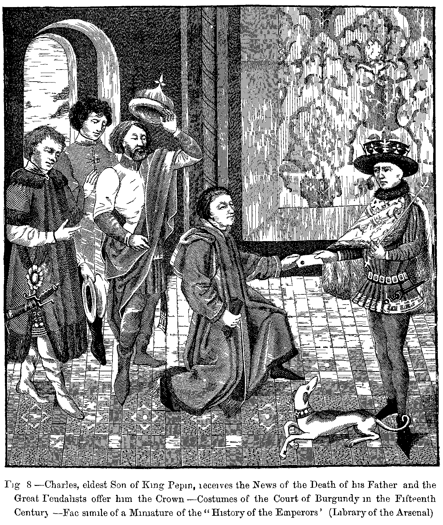 Influence of Ancient Costume.--Costume in the Fifteenth Century.--Hair.--Costumes in the Time of Charlemagne.--Origin of Modern National Dress.--Head-dresses and Beards: Time of St. Louis.--Progress of Dress: Trousers, Hose, Shoes, Coats, Surcoats, Capes.--Changes in the Fashions of Shoes and Hoods.--Livrée.--Cloaks and Capes.--Edicts against Extravagant Fashions.--Female Dress: Gowns, Bonnets, Head-dresses, &c.--Disappearance of Ancient Dress.--Tight-fitting Gowns.--General Character of Dress under Francis I.--Uniformity of Dress.