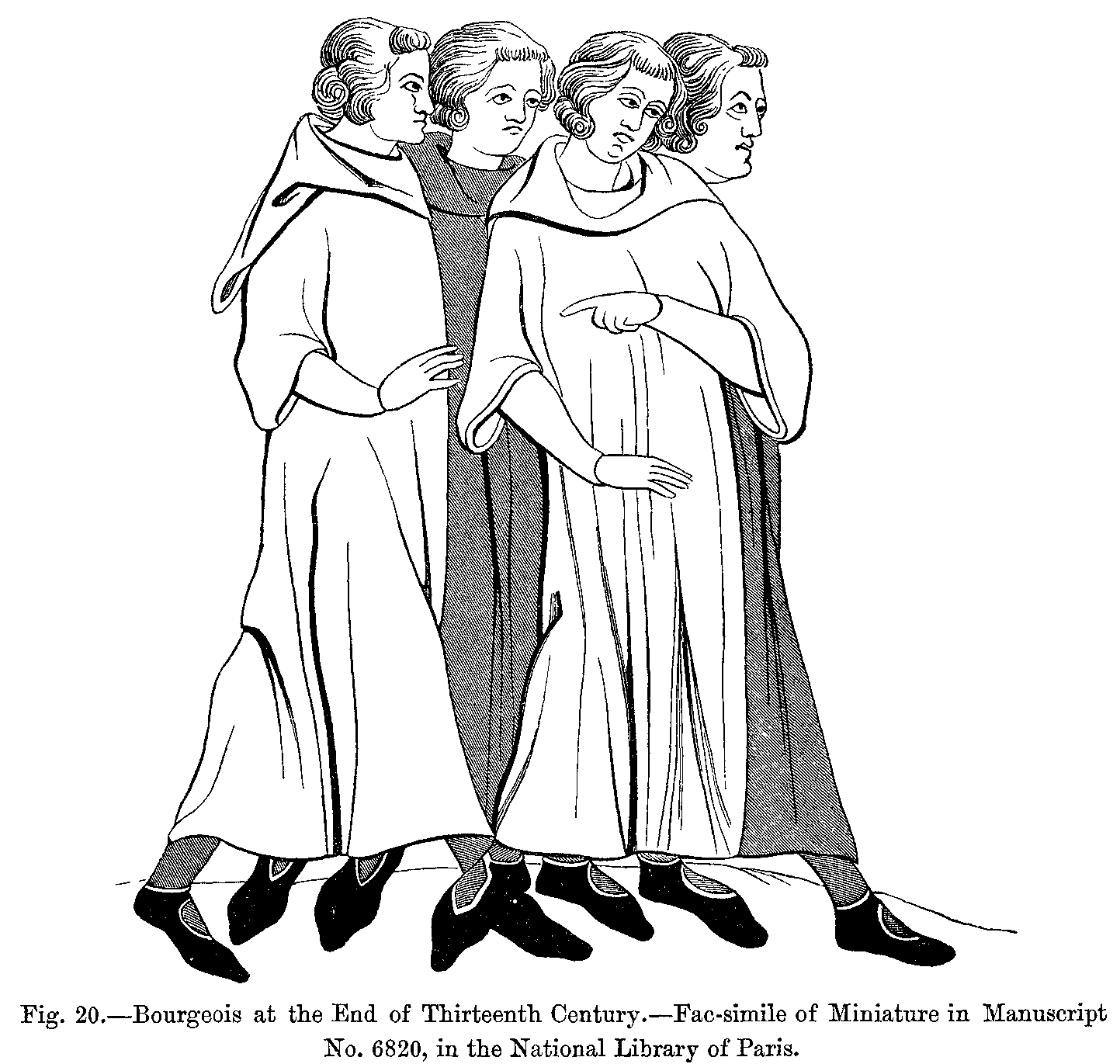 "Towards the year 1280," he says, "the dress of a man--not of a man as the word was then used, which meant serf, but of one to whom the exercise of human prerogatives was permitted, that is to say, of an ecclesiastic, a bourgeois, or a noble--was composed of six indispensable portions: the braies, or breeches, the stockings, the shoes, the coat, the surcoat, or cotte-hardie, and the chaperon, or head-dress. To these articles those who wished to dress more elegantly added, on the body, a shirt; on the shoulders, a mantle; and on the head, a hat, or fronteau.