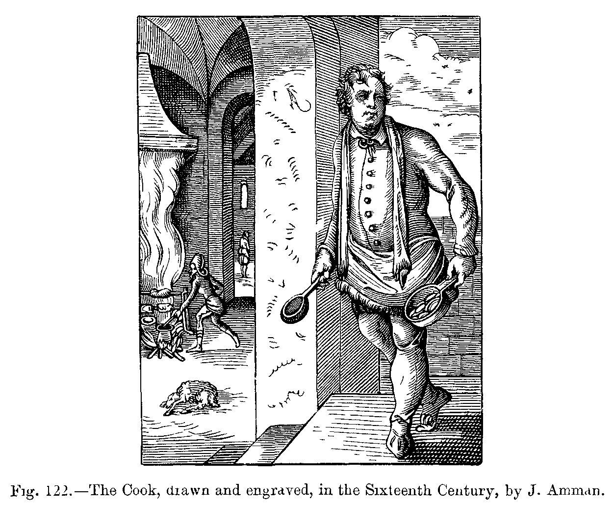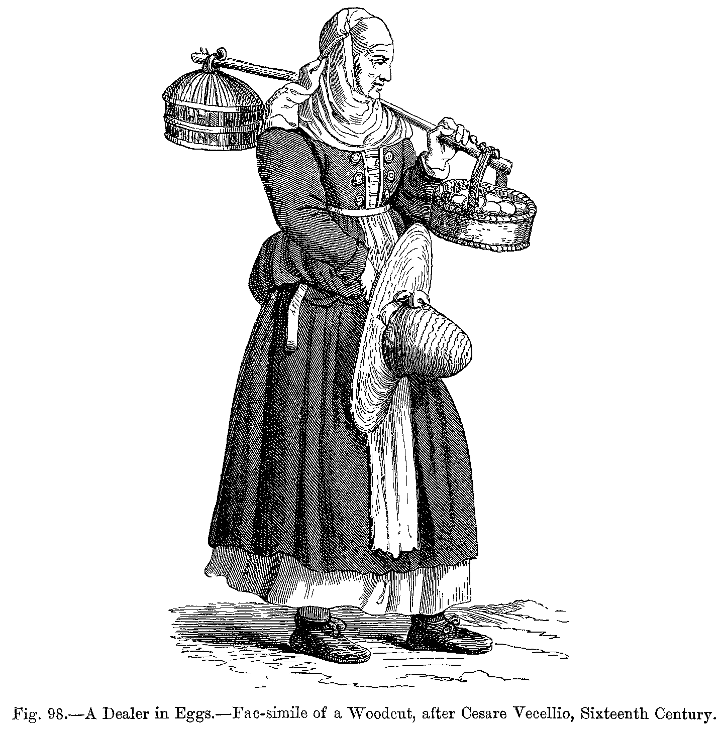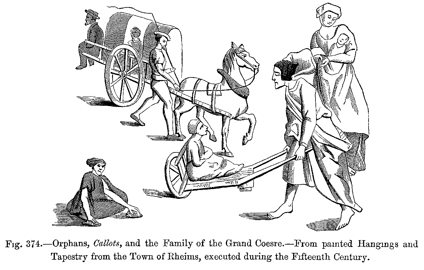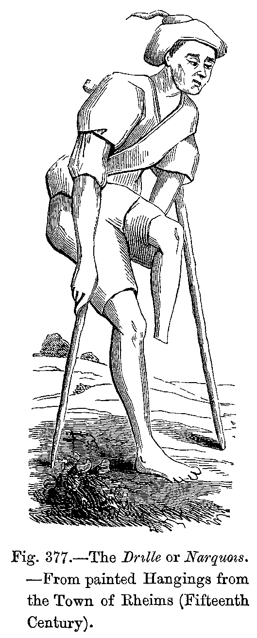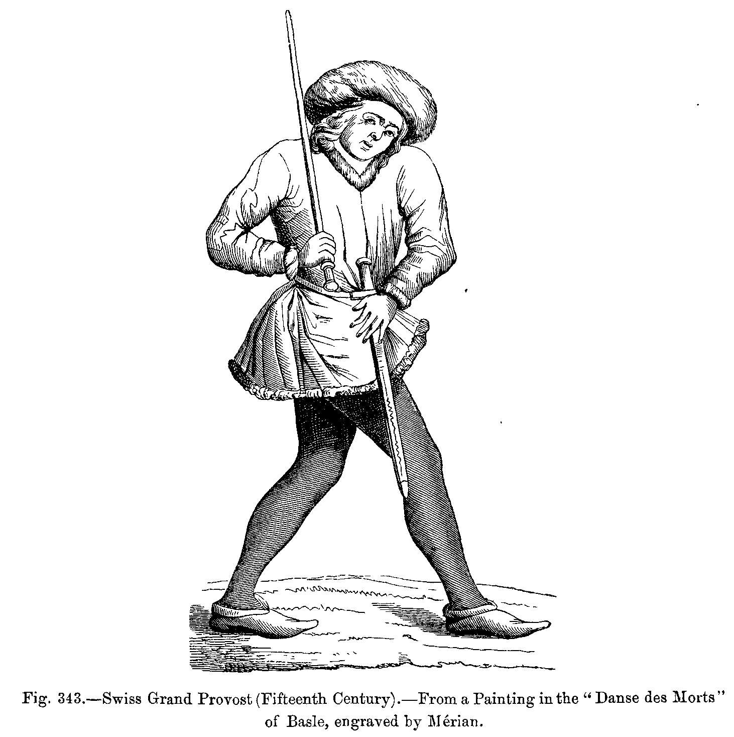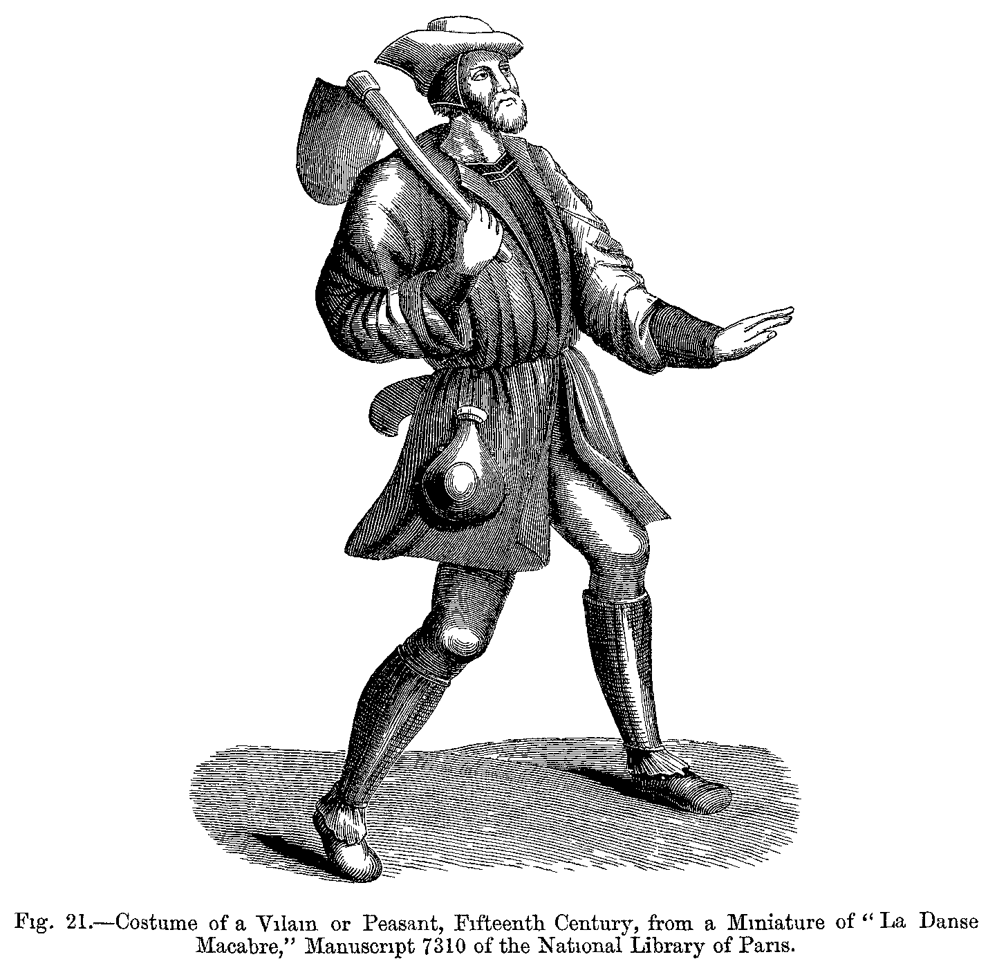 "Lastly, we have to mention the chape, which was always regarded as a necessary article of dress. The chape was the only protection against bad weather at a period when umbrellas and covered carriages were unknown. It was sometimes called chape de pluie, on account of the use to which it was applied, and it consisted of a large cape with sleeves, and was completely waterproof. It was borne behind a master by his servant, who, on account of this service was called a porte-chape. It is needless to say that the common people carried it themselves, either slung over their backs, or folded under the arm."