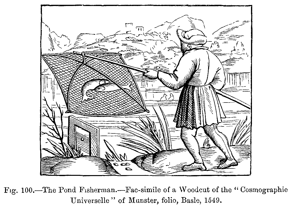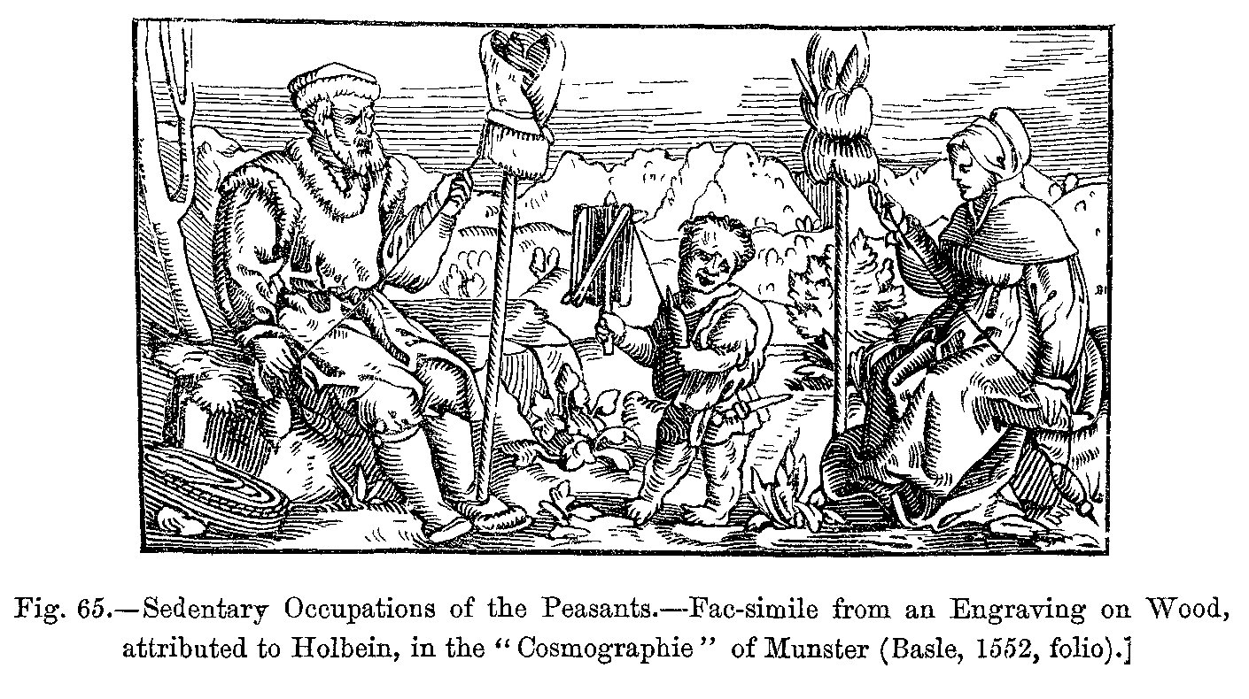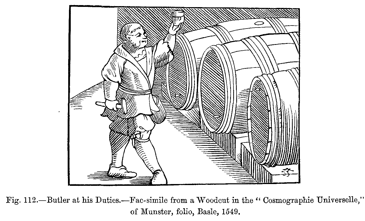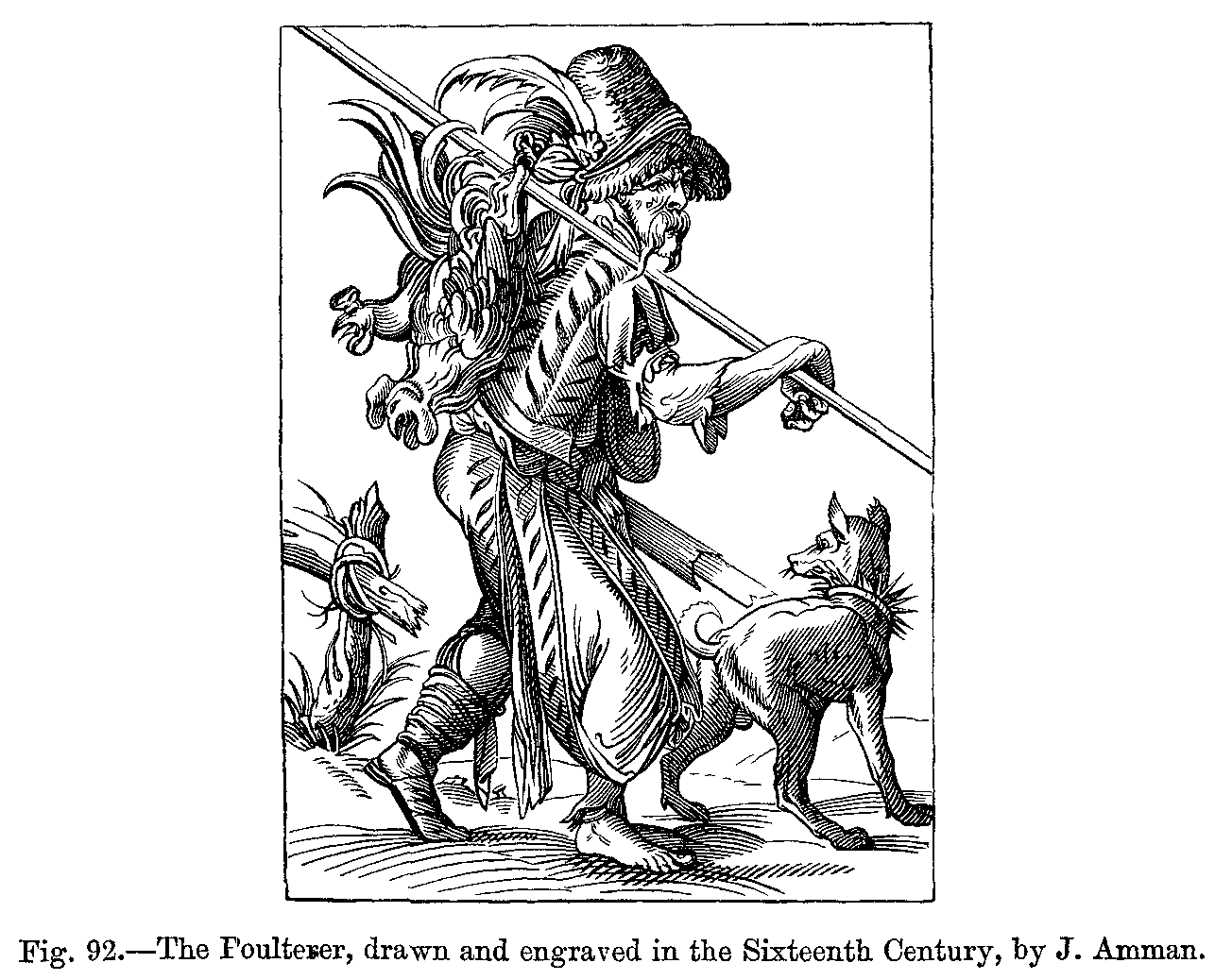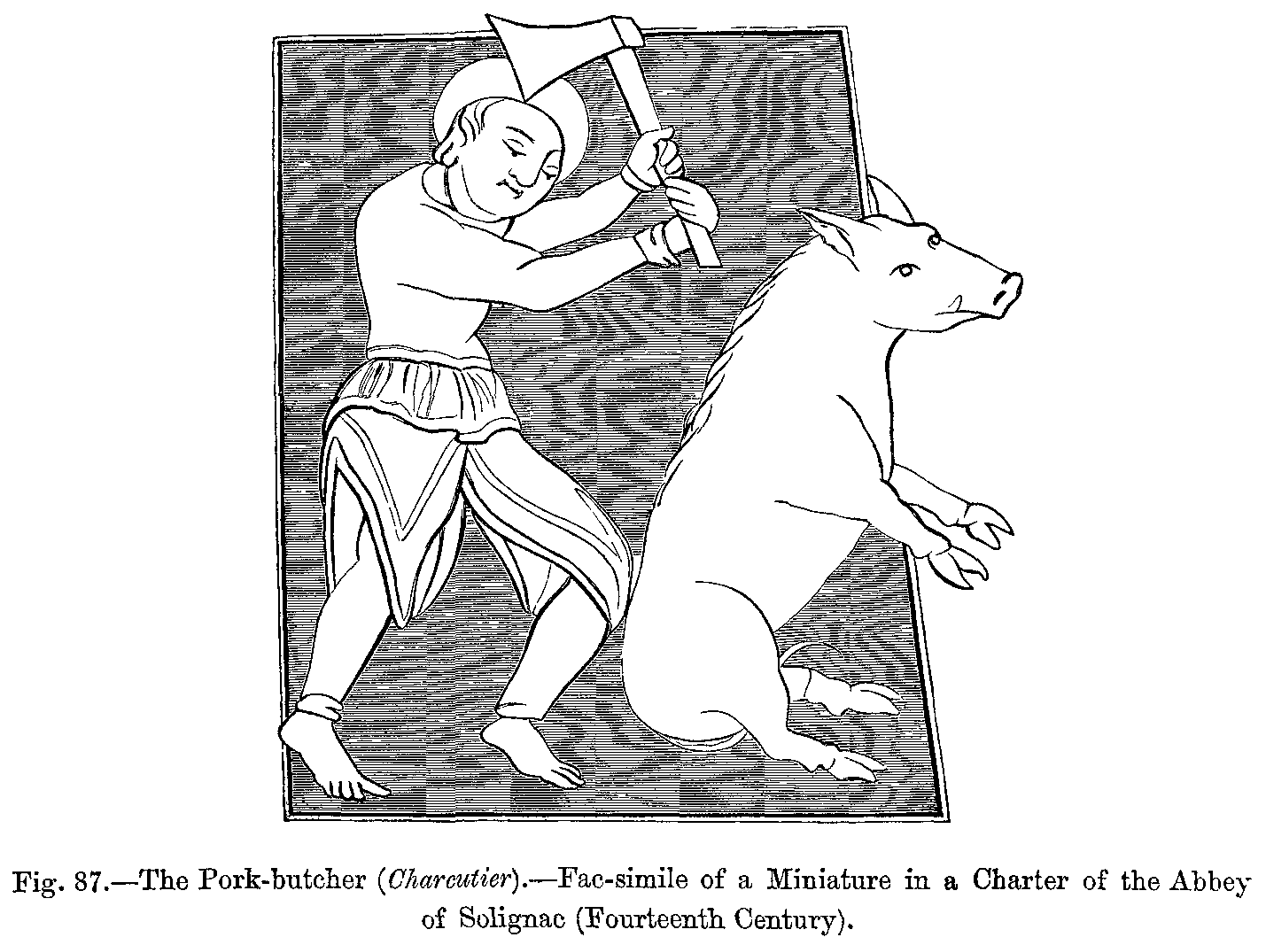 "Lastly, we have to mention the chape, which was always regarded as a necessary article of dress. The chape was the only protection against bad weather at a period when umbrellas and covered carriages were unknown. It was sometimes called chape de pluie, on account of the use to which it was applied, and it consisted of a large cape with sleeves, and was completely waterproof. It was borne behind a master by his servant, who, on account of this service was called a porte-chape. It is needless to say that the common people carried it themselves, either slung over their backs, or folded under the arm."