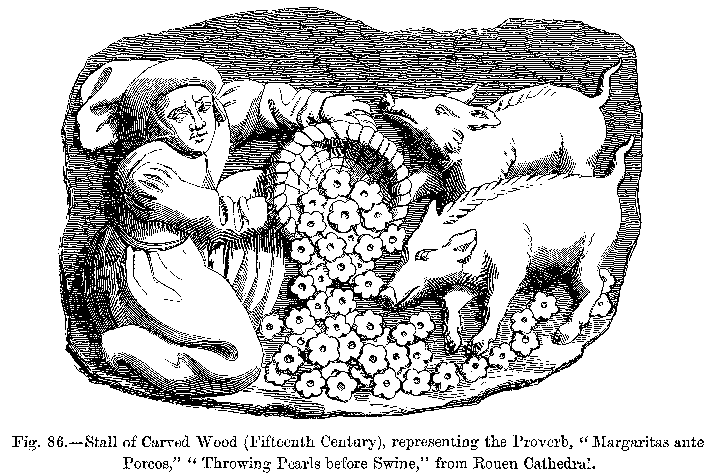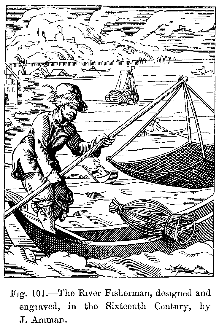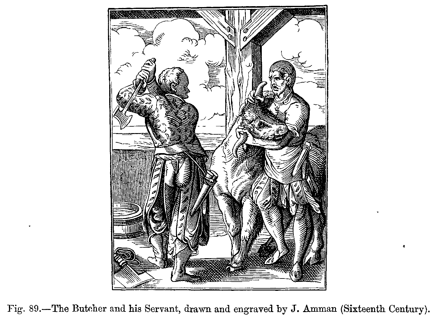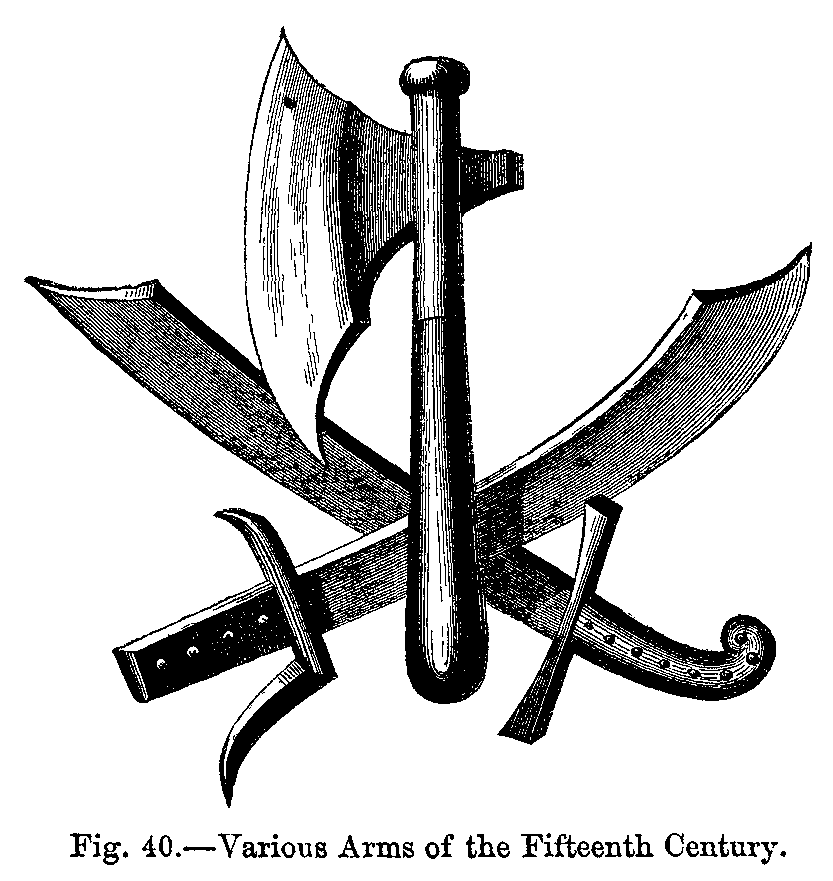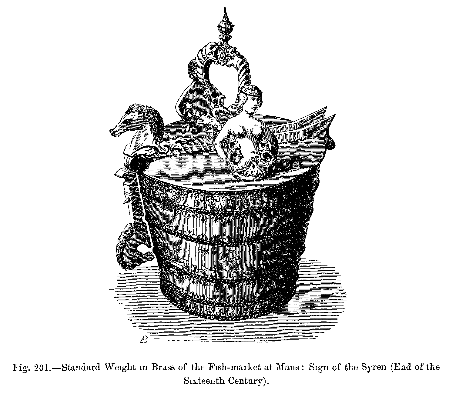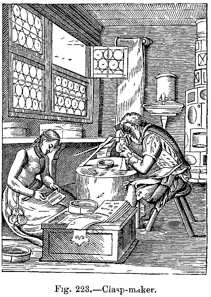 "Lastly, we have to mention the chape, which was always regarded as a necessary article of dress. The chape was the only protection against bad weather at a period when umbrellas and covered carriages were unknown. It was sometimes called chape de pluie, on account of the use to which it was applied, and it consisted of a large cape with sleeves, and was completely waterproof. It was borne behind a master by his servant, who, on account of this service was called a porte-chape. It is needless to say that the common people carried it themselves, either slung over their backs, or folded under the arm."