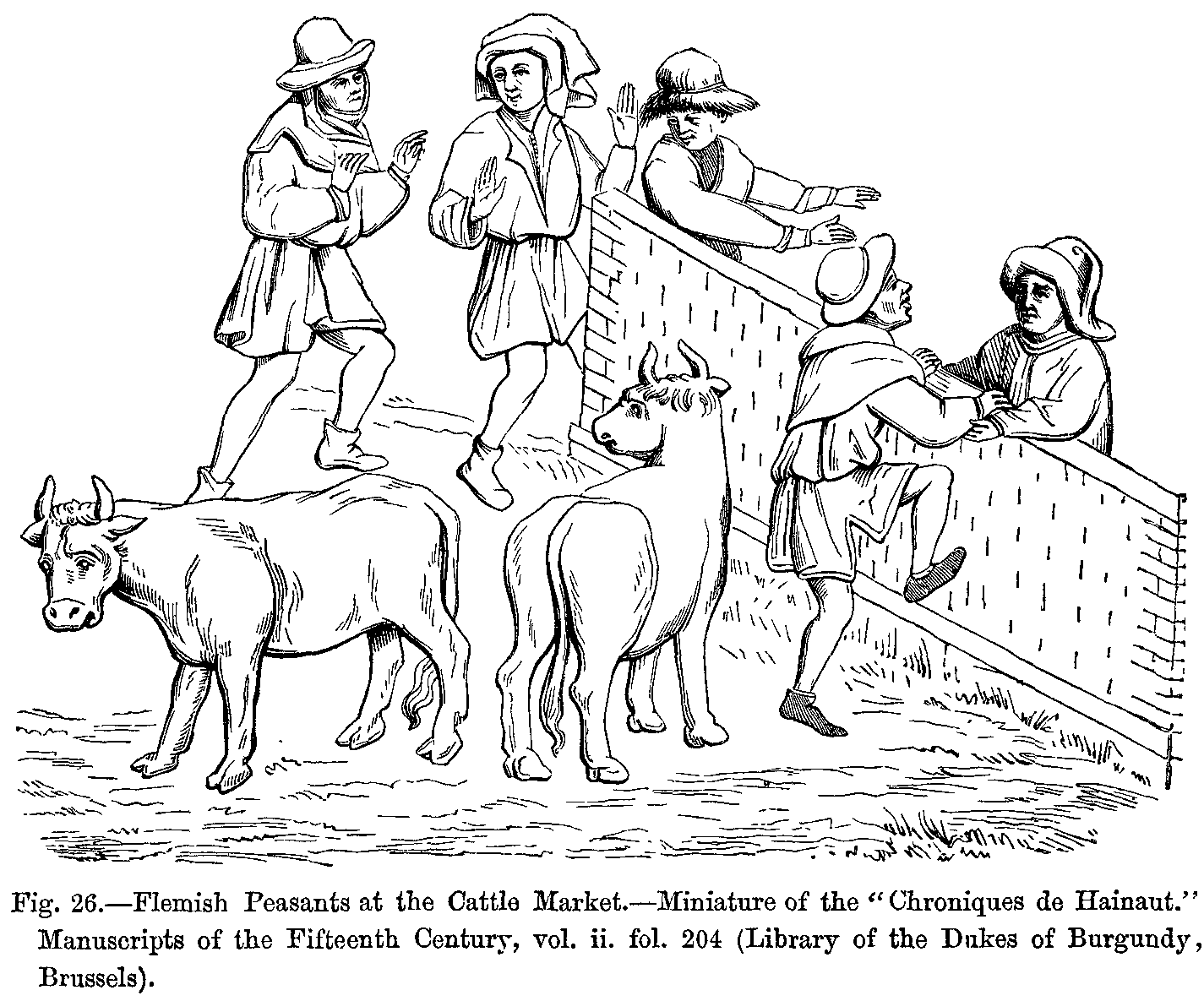 We may remark that the costume of the bourgeois was for a long time almost unchanged, even in the towns. Never having adopted either the tight-fitting hose or the balloon trousers, they wore an easy jerkin, a large cloak, and a felt hat, which the English made conical and with a broad brim.