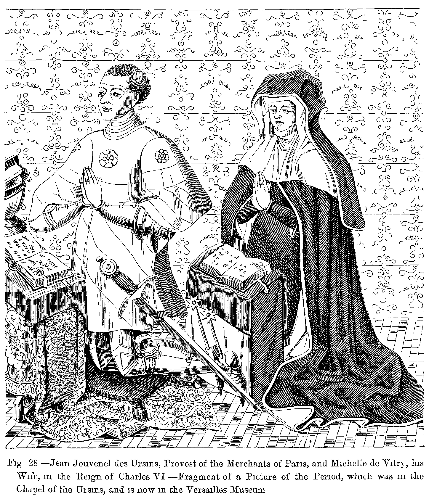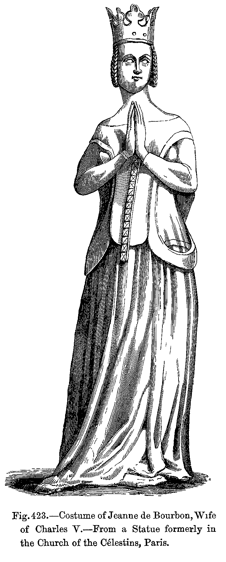 The statue of Queen Jeanne de Bourbon, wife of Charles V., formerly placed with that of her husband in the Church of the Célestins at Paris, gives the most faithful representation of this charming costume, to which our artists continually have recourse when they wish to depict any poetical scenes of the French Middle Ages (Fig. 423).