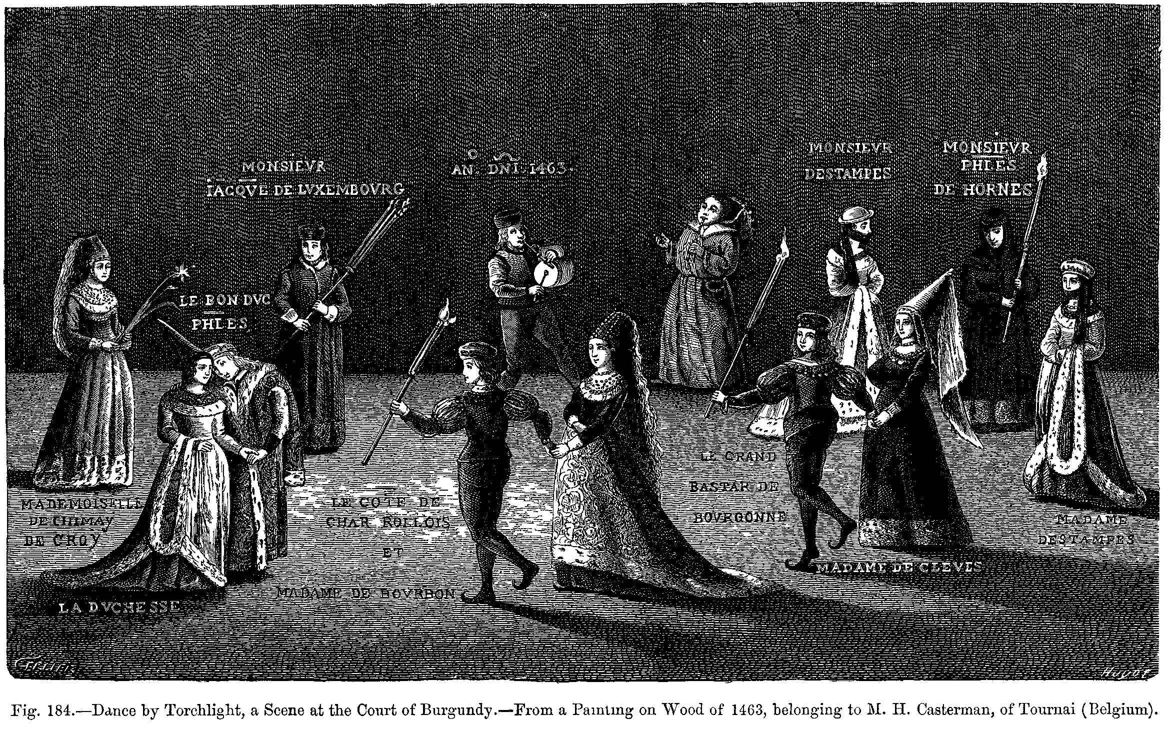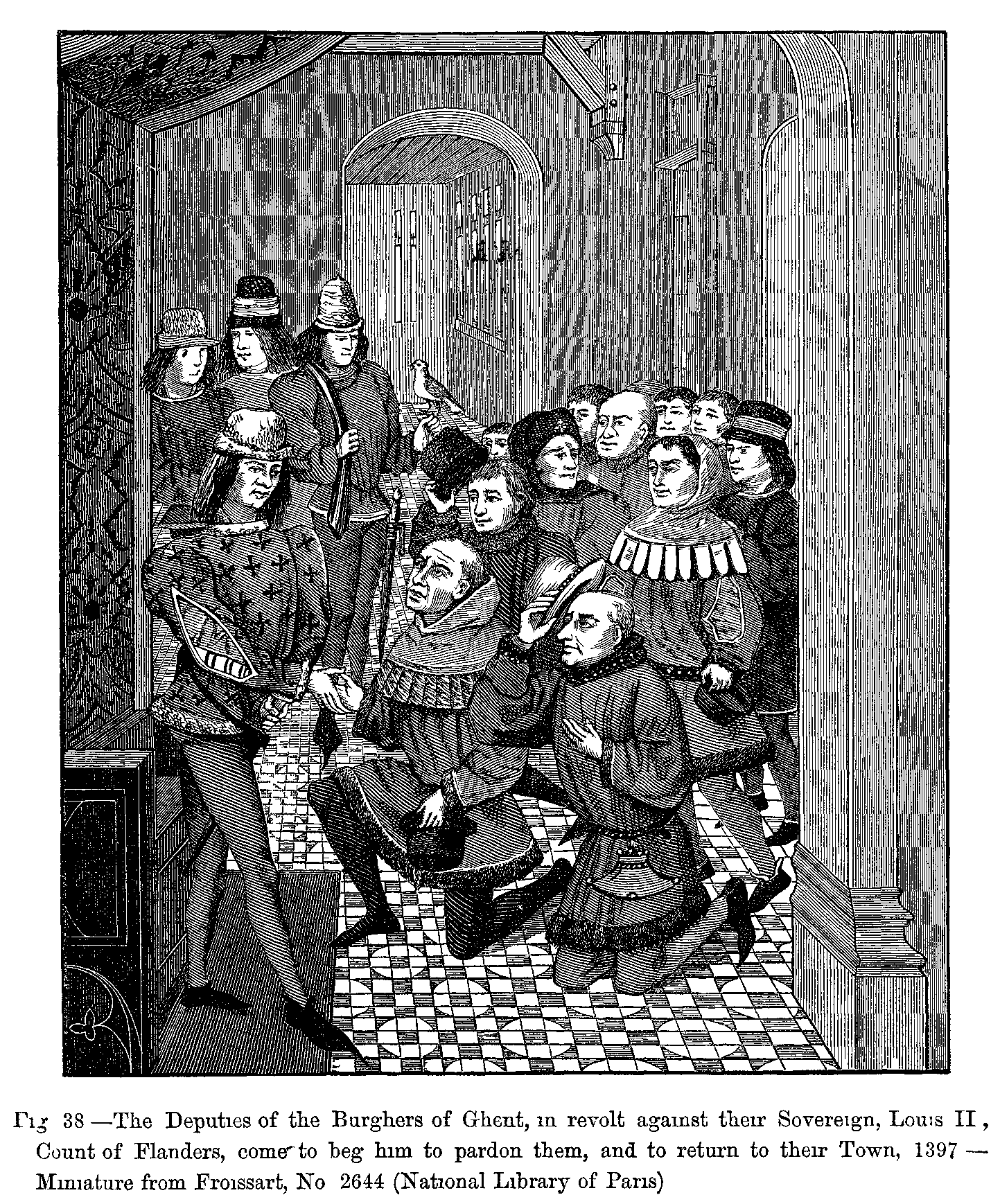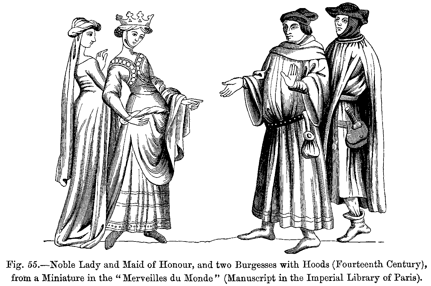 With the aid of our learned guide we have now reached a period (end of the thirteenth century) well adapted for this general study of the dress of our ancestors, inasmuch as soon afterwards men's dress at least, and especially that of young courtiers, became most ridiculously and even indecently exaggerated. To such an extent was this the case, that serious calamities having befallen the French nation about this time, and its fashions having exercised a considerable influence over the whole continent of Europe, contemporary historians do not hesitate to regard these public misfortunes as a providential chastisement inflicted on France for its disgraceful extravagance in dress.