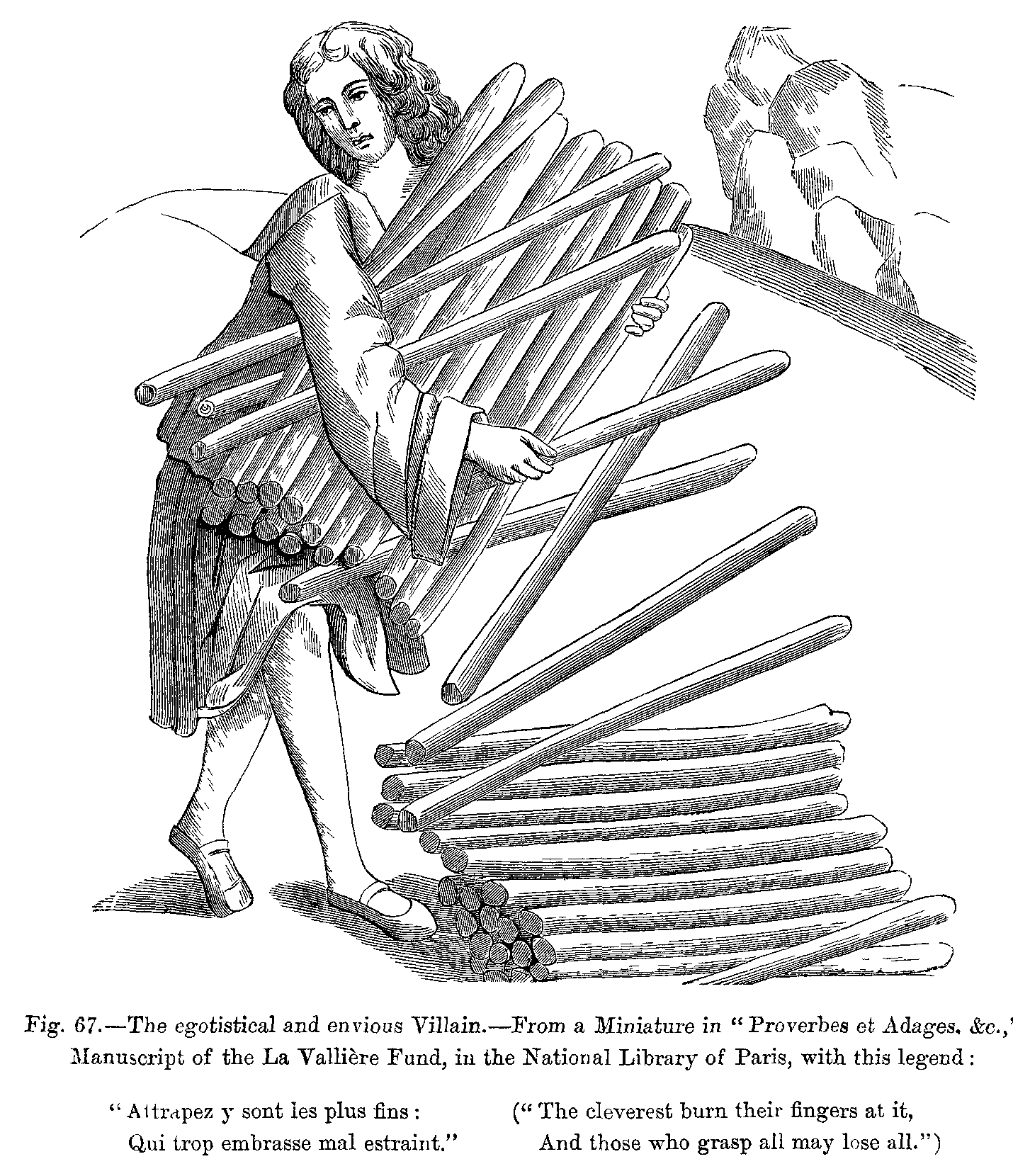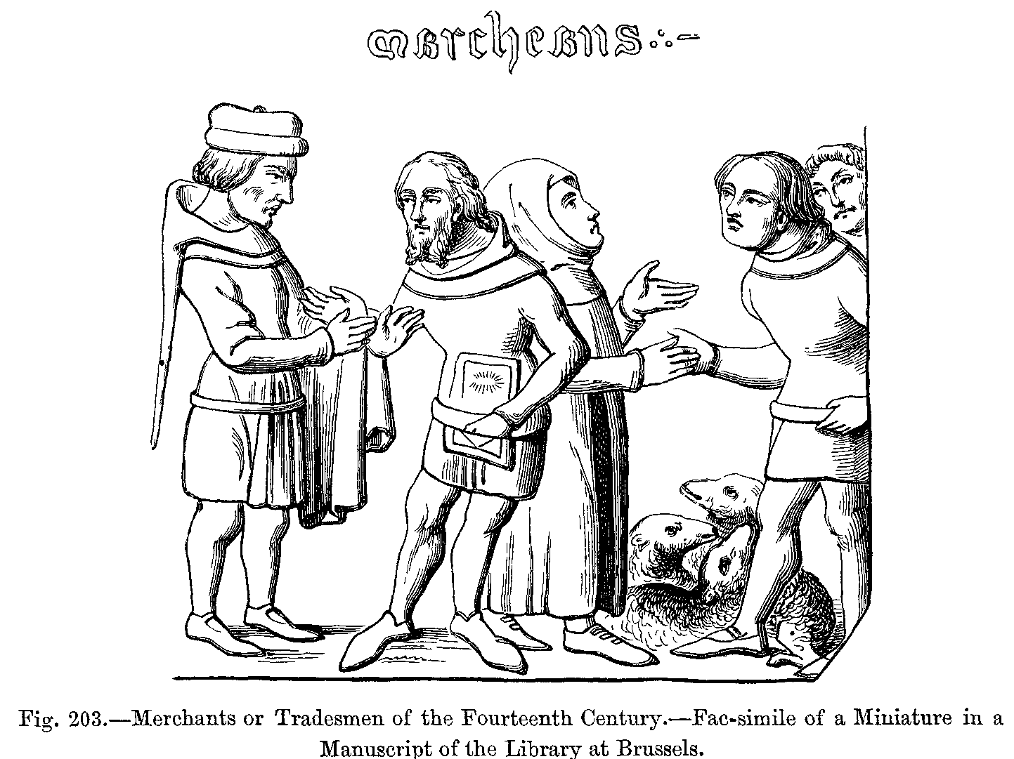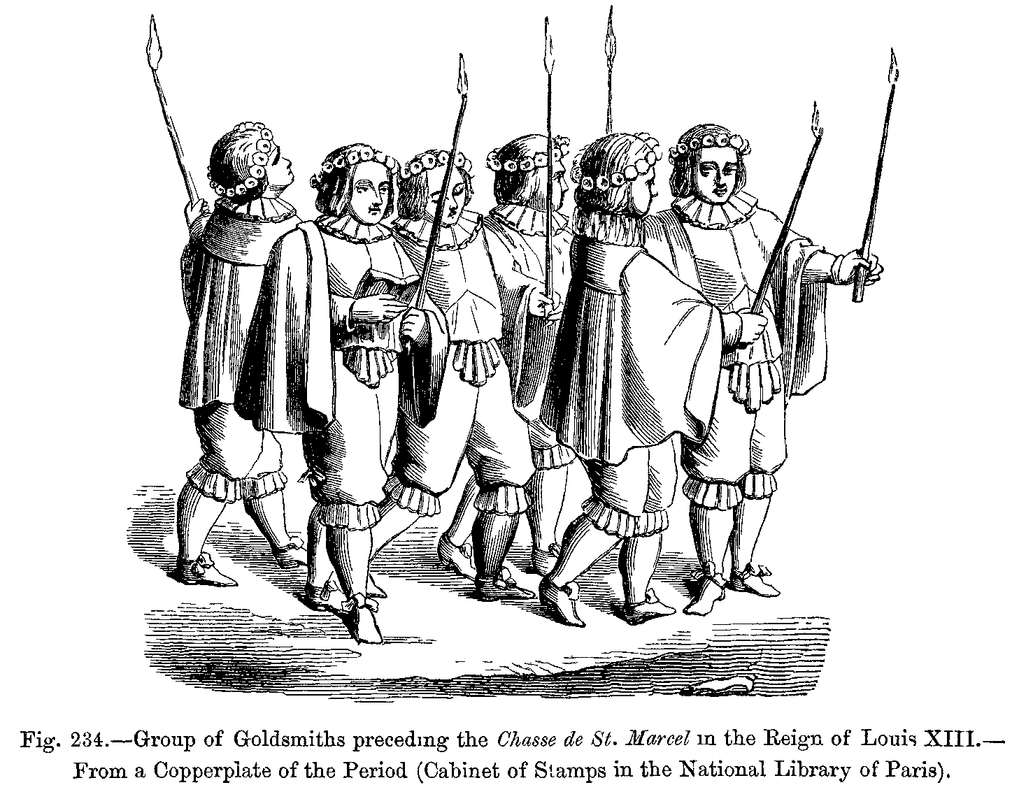 With the aid of our learned guide we have now reached a period (end of the thirteenth century) well adapted for this general study of the dress of our ancestors, inasmuch as soon afterwards men's dress at least, and especially that of young courtiers, became most ridiculously and even indecently exaggerated. To such an extent was this the case, that serious calamities having befallen the French nation about this time, and its fashions having exercised a considerable influence over the whole continent of Europe, contemporary historians do not hesitate to regard these public misfortunes as a providential chastisement inflicted on France for its disgraceful extravagance in dress.