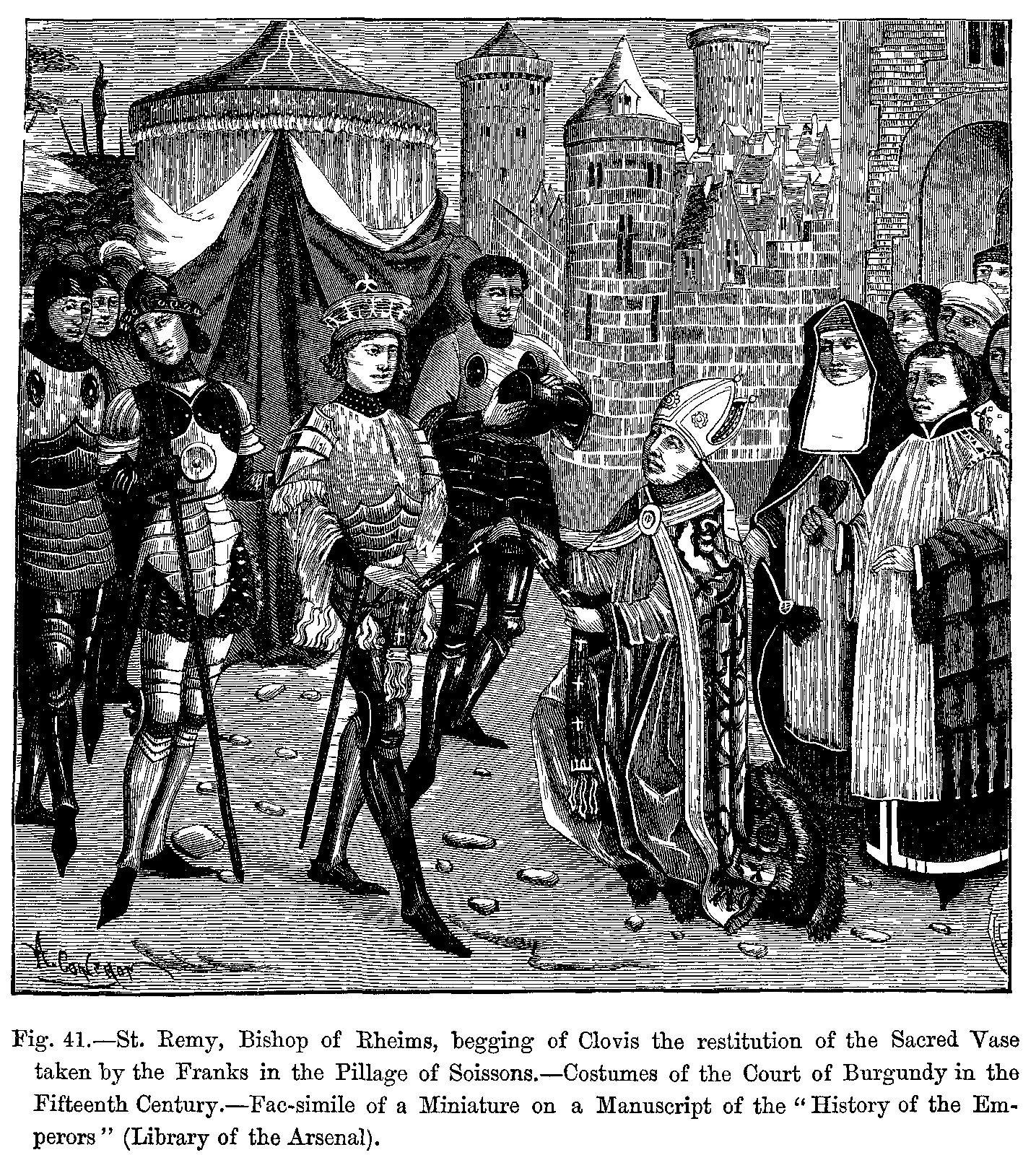Fig. 402.--Costume of King Clovis (Sixth Century).--From a Statue on his Tomb, formerly in the Abbey of St. Geneviève.