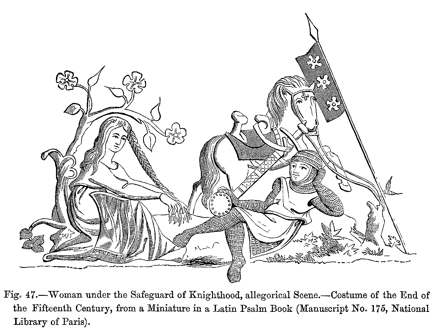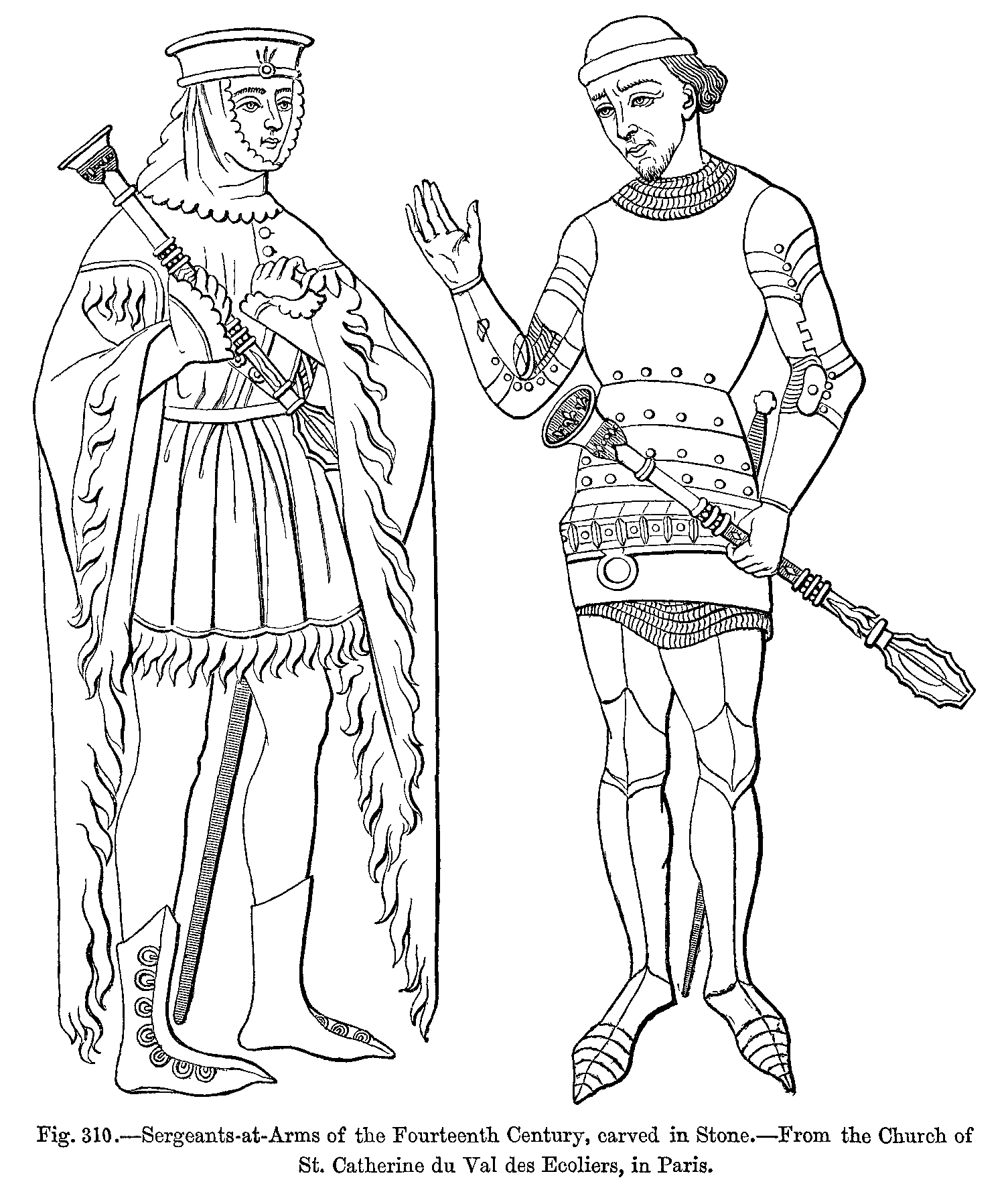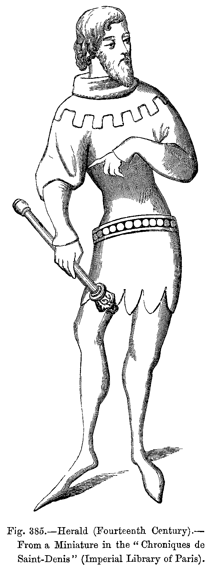 The surcoat (sur-cotte) was at first a garment worn only by females, but it was soon adopted by both sexes: it was originally a large wrapper with sleeves, and was thrown over the upper part of the robe (cotte), hence its name, sur-cotte. Very soon it was made without sleeves--doubtless, as M. Quicherat remarks, that the under garment, which was made of more costly material, might be seen; and then, with the same object, and in order that the due motion of the limbs might not be interfered with, the surcoat was raised higher above the hips, and the arm-holes were made very large.