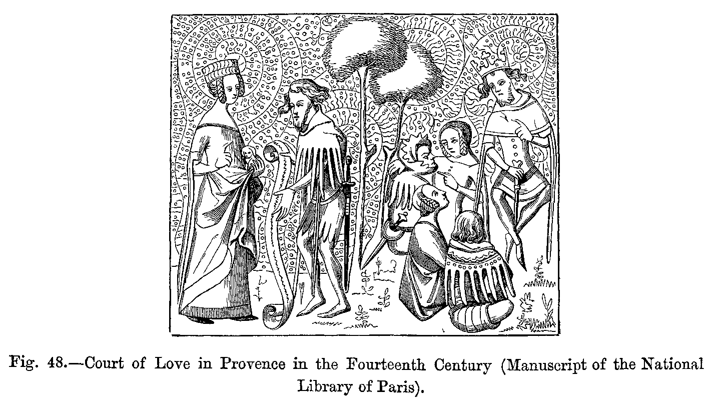 Fig. 416.--Costumes of the Thirteenth Century: Tristan and the beautiful Yseult.--From a Miniature in the Romance of "Tristan," Manuscript of the Fourteenth Century (Imperial Library of Paris).