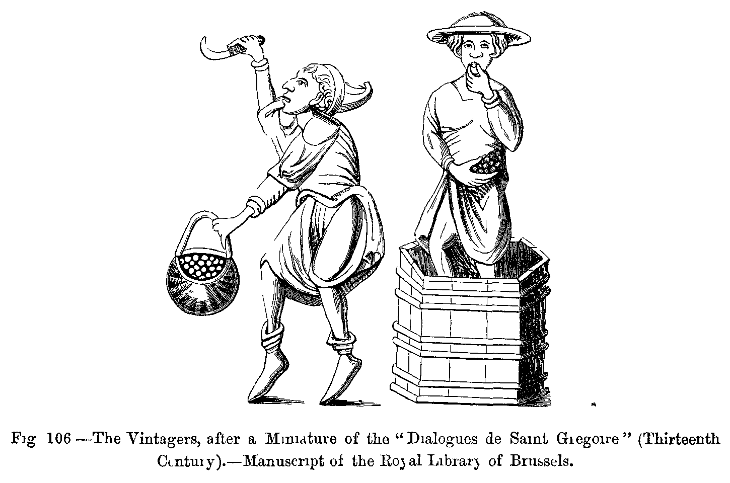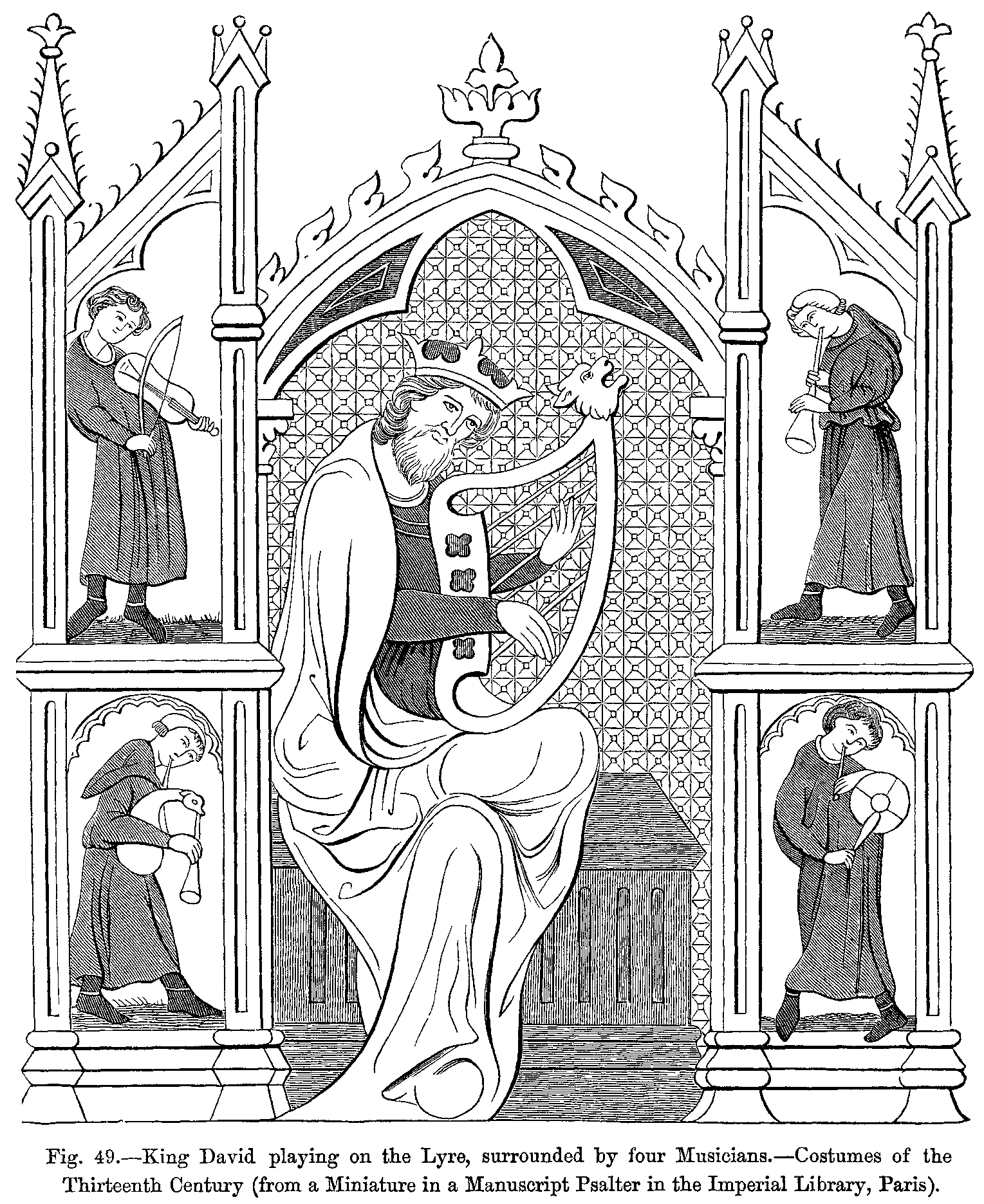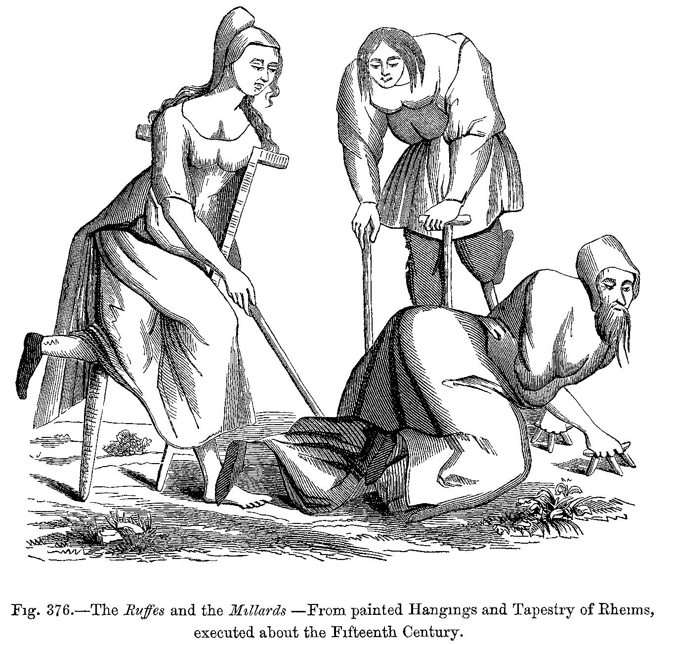 Before proceeding further in our history of mediæval dress, we must forestall a remark which will not fail to be made by the reader, and this is, that we seem to occupy ourselves exclusively with the dress of kings, queens, and other people of note. But we must reply, that though we are able to form tolerably accurate notions relative to the dress of the upper classes during these remote periods, we do not possess any reliable information relative to that of the lower orders, and that the written documents, as well as the sculptures and paintings, are almost useless on this point. Nevertheless, we may suppose that the dress of the men in the lowest ranks of society has always been short and tight, consisting of braies, or tight drawers, mostly made of leather, of tight tunics, of sayons or doublets, and of capes or cloaks of coarse brown woollen. The tunic was confined at the waist by a belt, to which the knife, the purse, and sometimes the working tools were suspended. The head-dress of the people was generally a simple cap made of thick, coarse woollen cloth or felt, and often of sheep's skin. During the twelfth century, a person's rank or social position was determined by the head-dress. The cap was made of velvet for persons of rank, and of common cloth for the poor. The cornette, which was always an appendage to the cap, was made of cloth, with which the cap might be fastened or adjusted on the head. The mortier, or round cap, dates from the earliest centuries, and was altered both in shape and material according to the various changes of fashion; but lawyers of high position continued to wear it almost in its original shape, and it became like a professional badge for judges and advocates.
