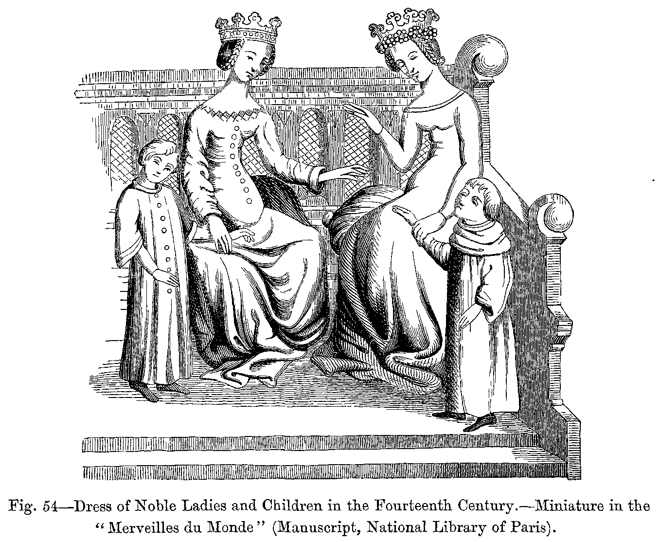 No great change was made in the dress of the two sexes during the tenth century. "Nothing was more simple than the head-dress of women," says M. Jules Quicherat; "nothing was less studied than their mode of wearing their hair; nothing was more simple, and yet finer, than their linen. The elegant appearance of their garments recalls that of the Greek and Roman, women. Their dresses were at times so tight as to display all the elegance of their form, whilst at others they were made so high as completely to cover the neck; the latter were called cottes-hardies. The cotte-hardie, which has at all times been part of the dress of French women, and which was frequently worn also by men, was a long tunic reaching to the heels, fastened in at the waist and closed at the wrists. Queens, princesses, and ladies of the nobility wore in addition a long cloak lined with ermine, or a tunic with or without sleeves; often, too, their dress consisted of two tunics, and of a veil or drapery, which was thrown over the head and fell down before and behind, thus entirely surrounding the neck."