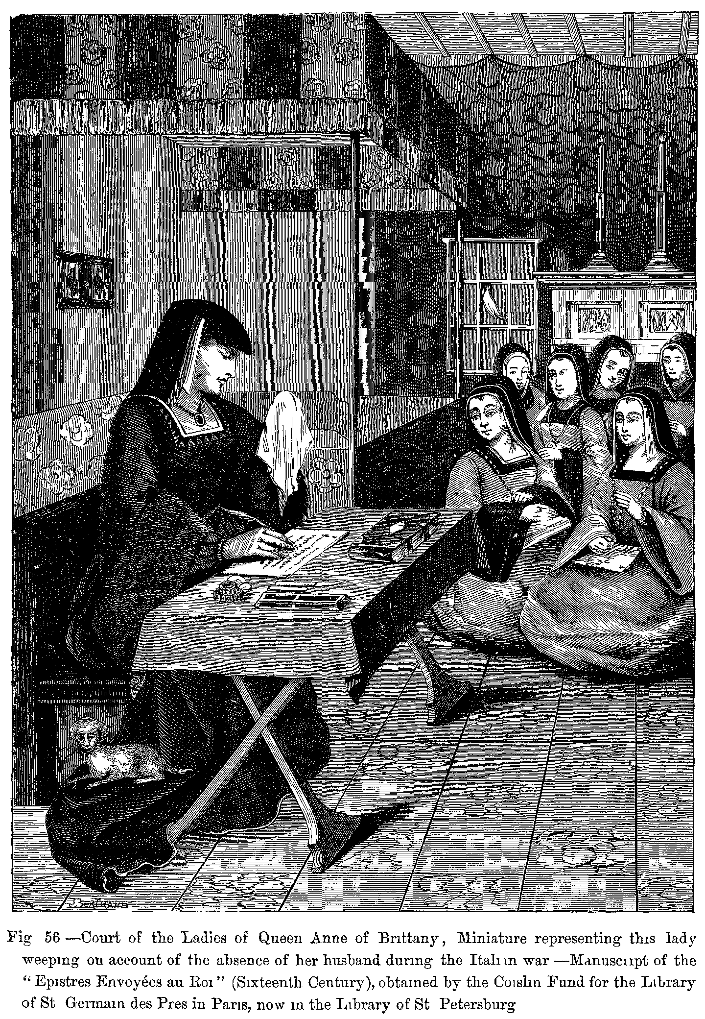 Under Louis XII., Queen Anne invented a low head-dress--or rather it was invented for her--consisting of strips of velvet or of black or violet silk over other bands of white linen, which encircled the face and fell down over the back and shoulders; the large sleeves of the dresses had a kind of turned-over borders, with trimmings of enormous width. Men adopted short tunics, plaited and tight at the waist. The upper part of the garments of both men and women was cut in the form of a square over the chest and shoulders, as most figures are represented in the pictures of Raphael and contemporary painters.